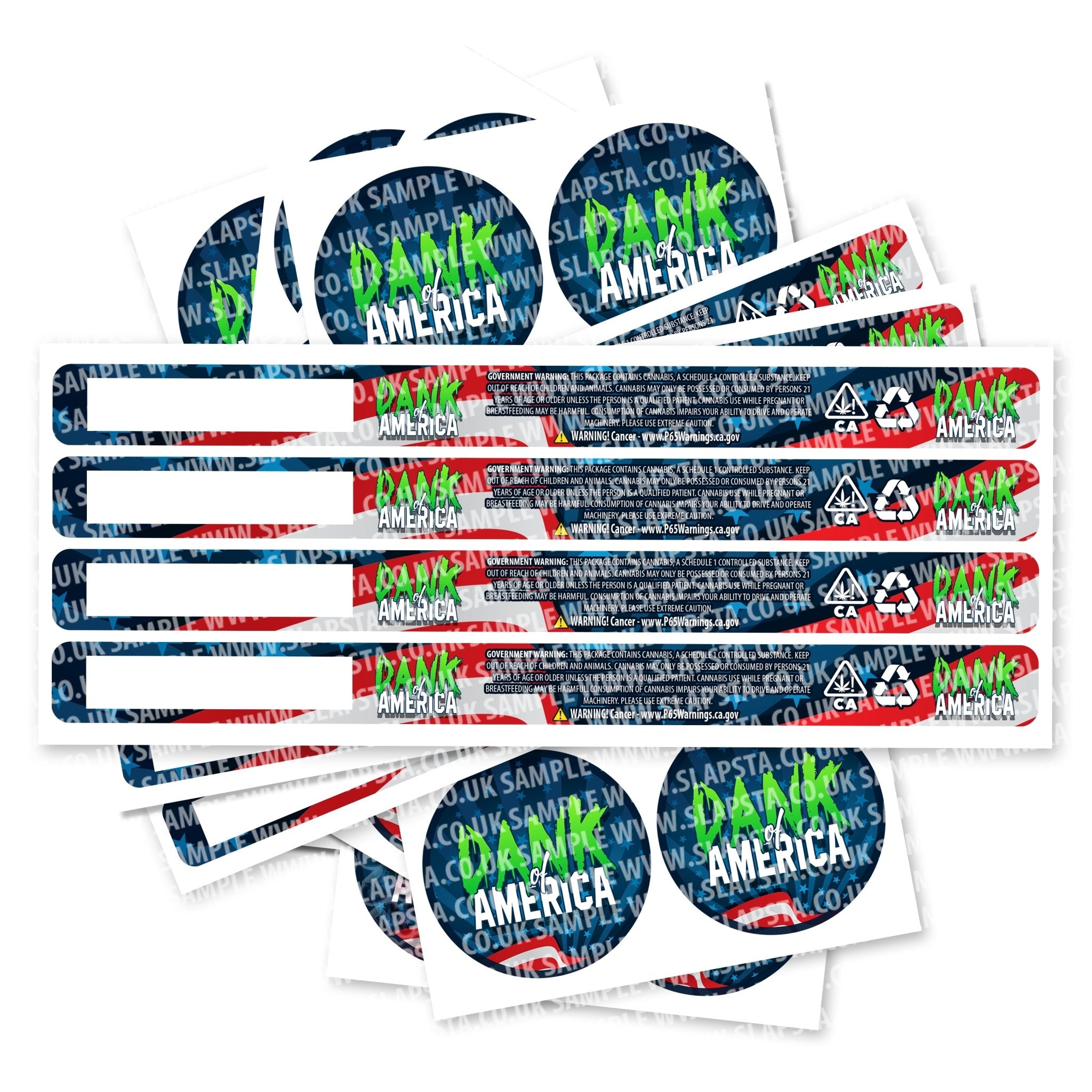 Ready-made Dank Of America PRESSITIN strain labels, available to fit all PRESSITIN (self-seal tins) sizes. If you require your labels made to a certain size, please contact us. For bespoke designs, please check out our design section.