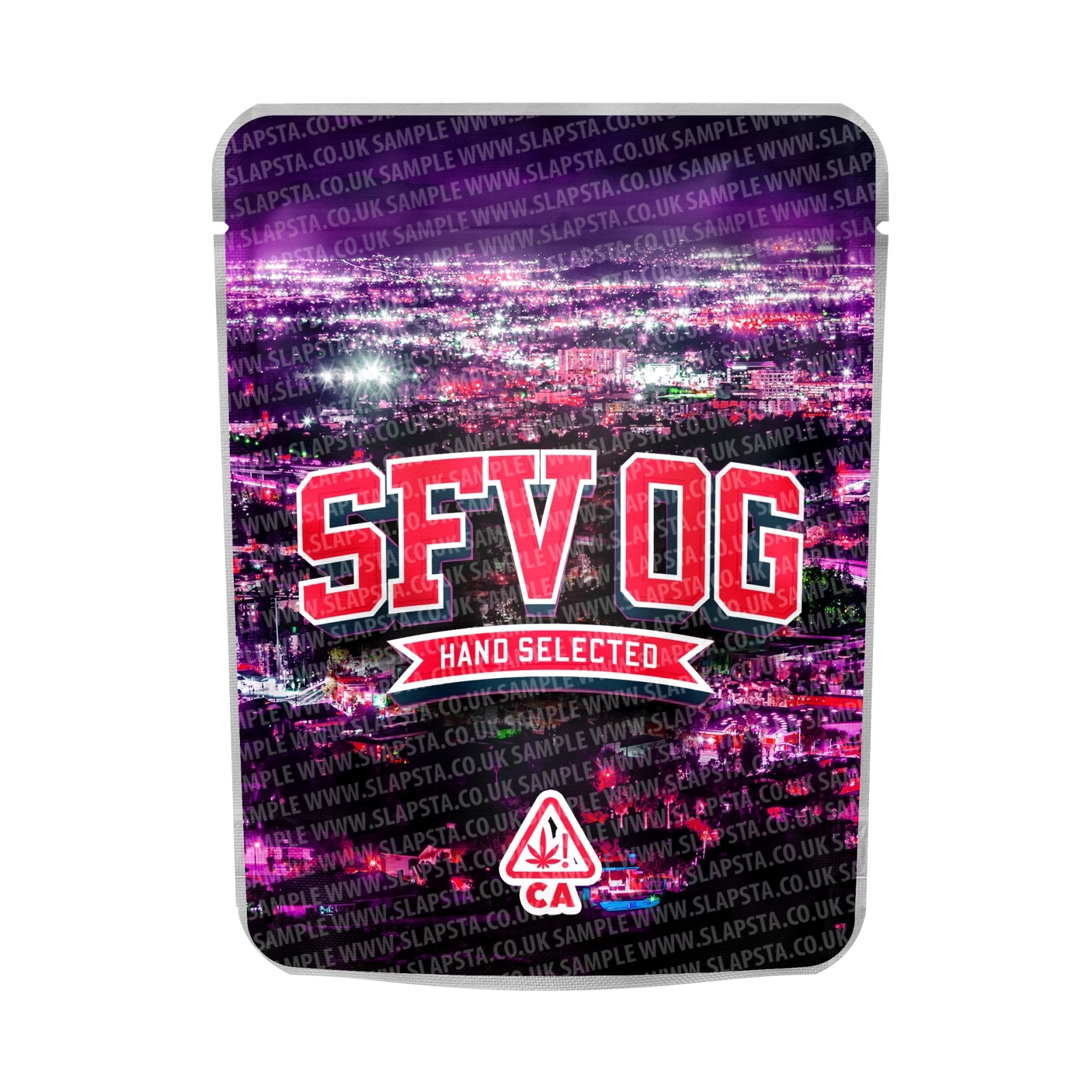 Resealable, smell-proof mylar pouches, with SFV OG vinyl sticker pre-applied. Available in 3.5grams, 7grams, 14grams, and 28gram sizes, with child-resistant option.