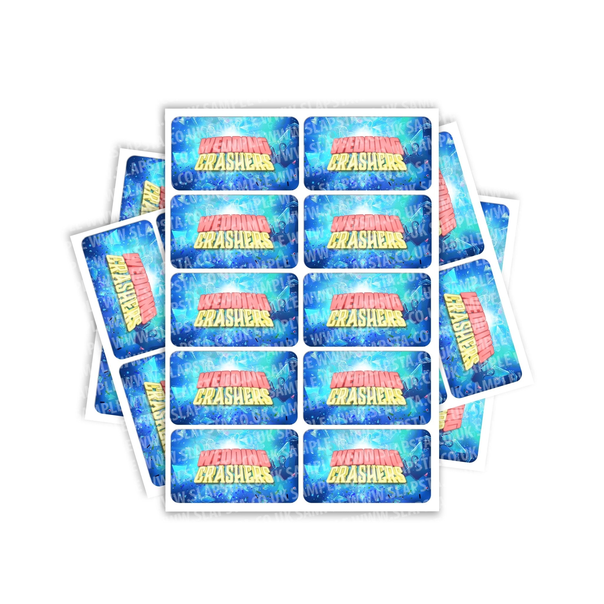 Wedding Crashers gloss vinyl sticker labels. Please choose the size and quantity you require. For help sizing, please view the size guide image or use the measurements provided.
