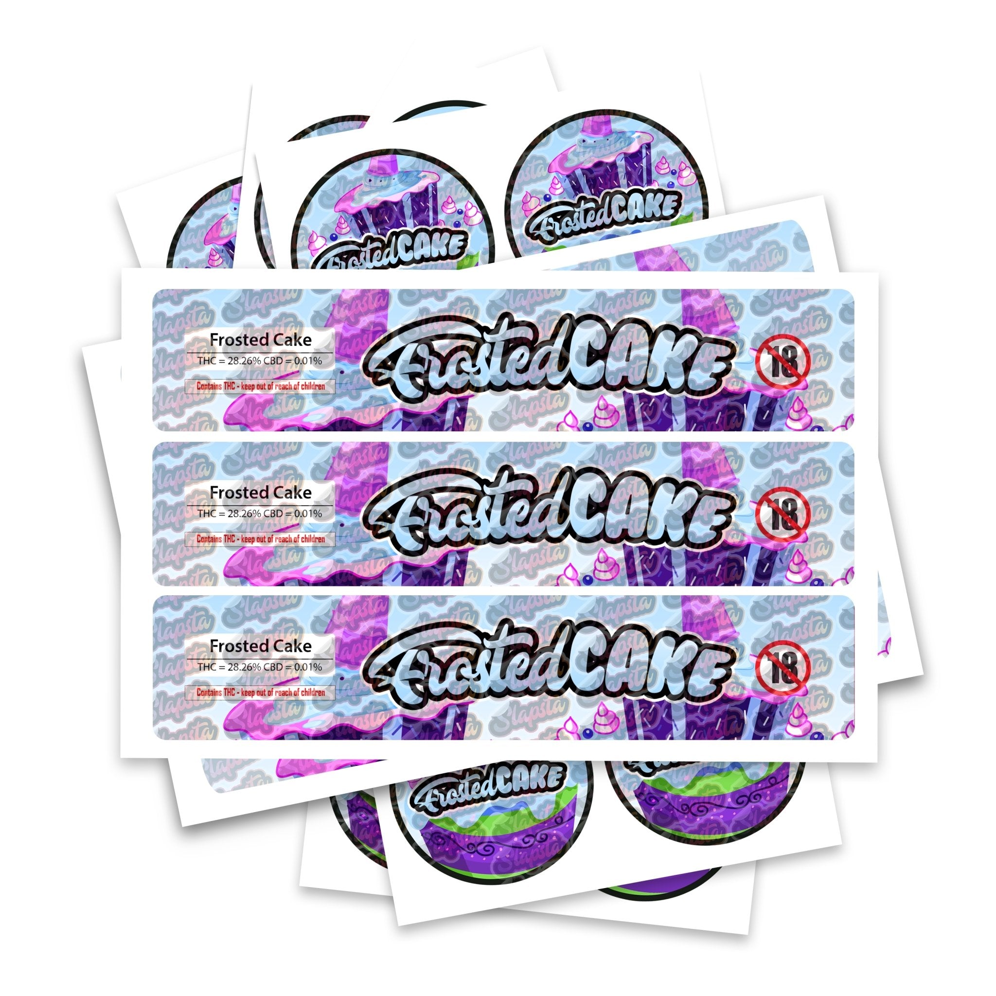 Ready-made Frosted Cakes strain labels, available to fit our JAR and TAMPER STRIP POT Range. If you require your labels made to a certain size, please contact us. For bespoke designs, please check out our design section.