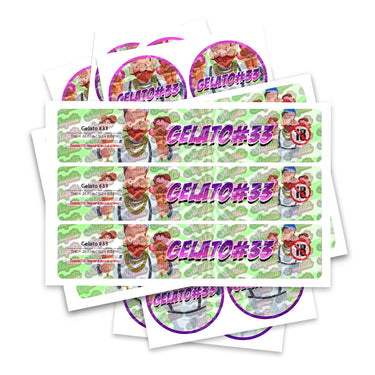 Ready-made Gelato 33 strain labels, available to fit our JAR and TAMPER STRIP POT Range. If you require your labels made to a certain size, please contact us. For bespoke designs, please check out our design section.