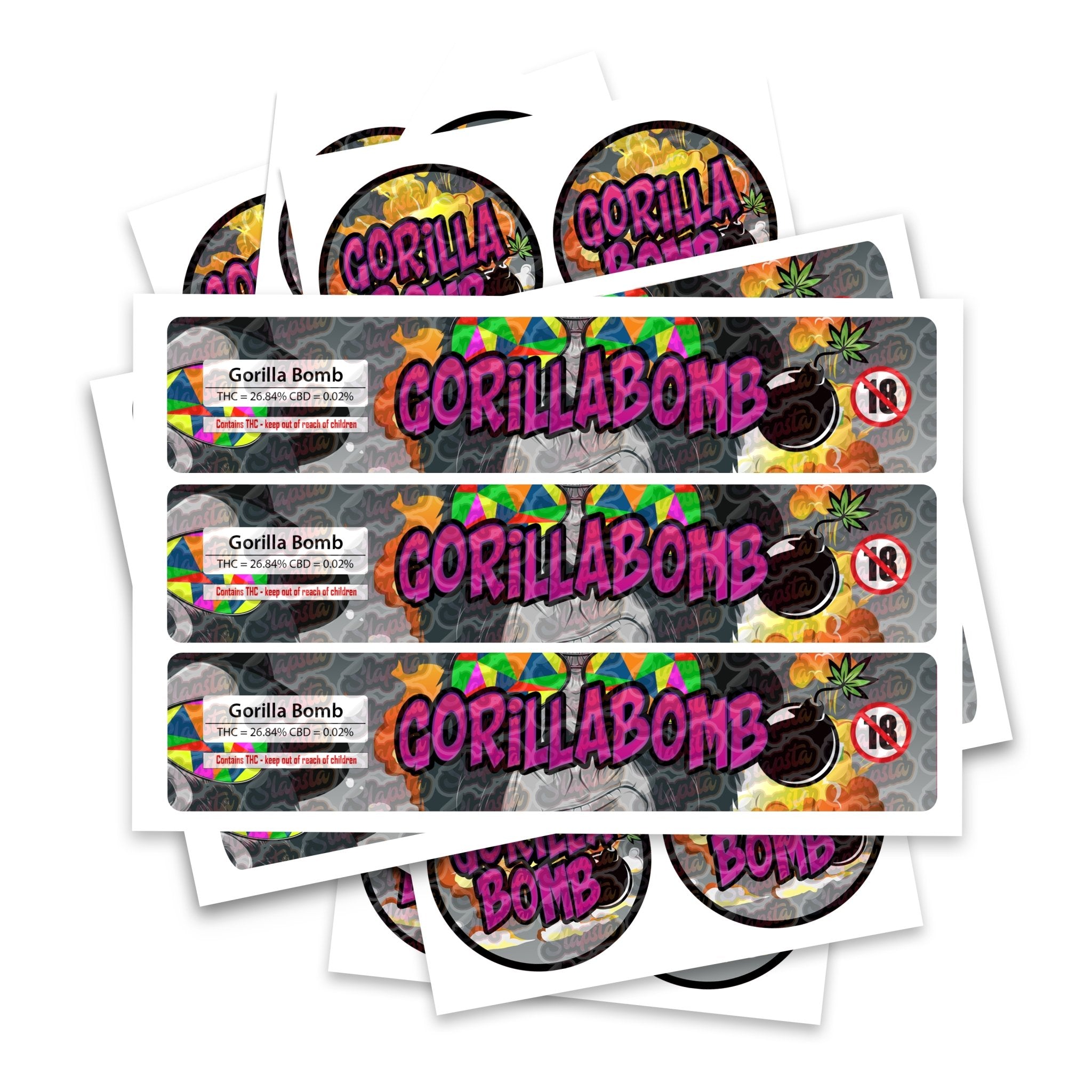 Ready-made Gorilla Bomb strain labels, available to fit our JAR and TAMPER STRIP POT Range. If you require your labels made to a certain size, please contact us. For bespoke designs, please check out our design section.