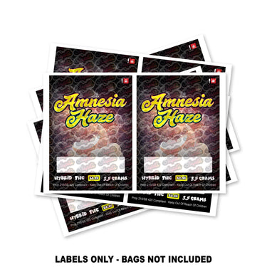Ready-made Amnesia Haze mylar cover labels, available to perfectly fit our MYLAR BARRIER POUCHES
