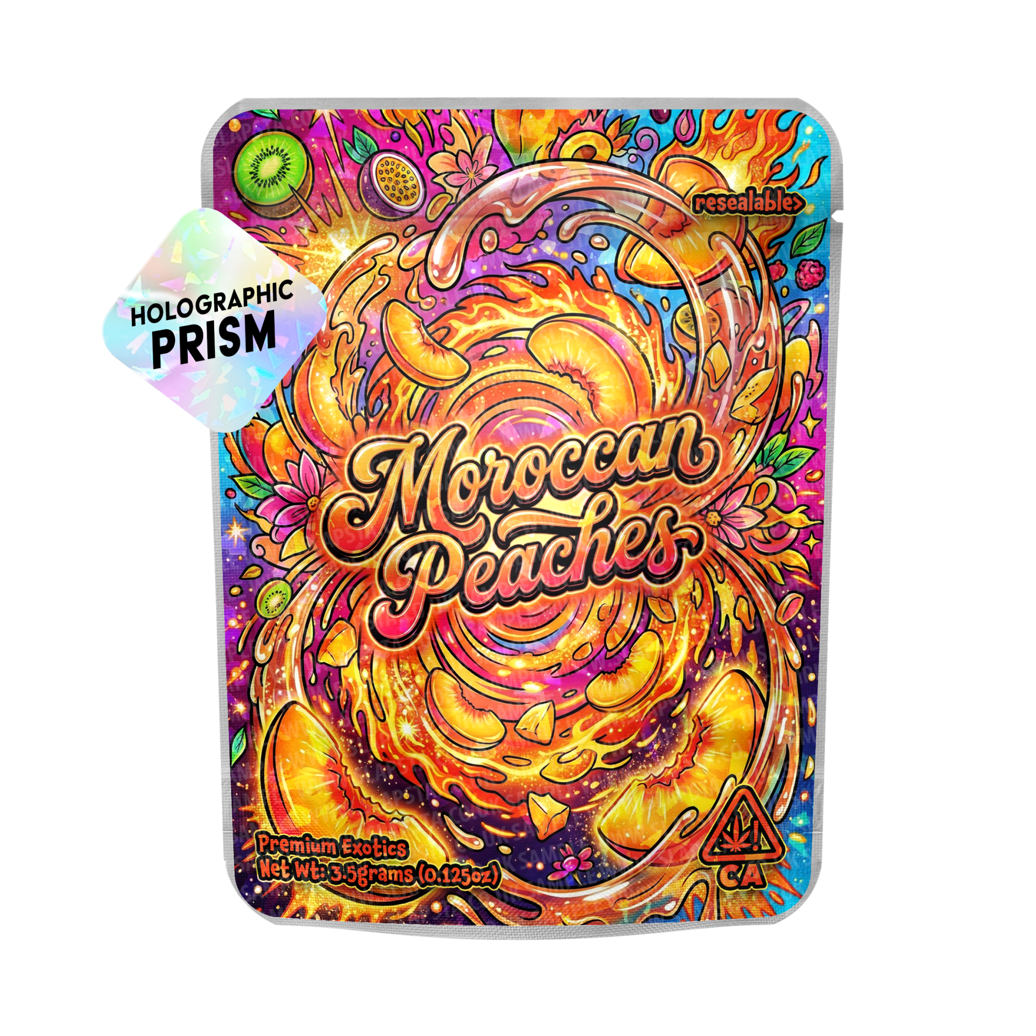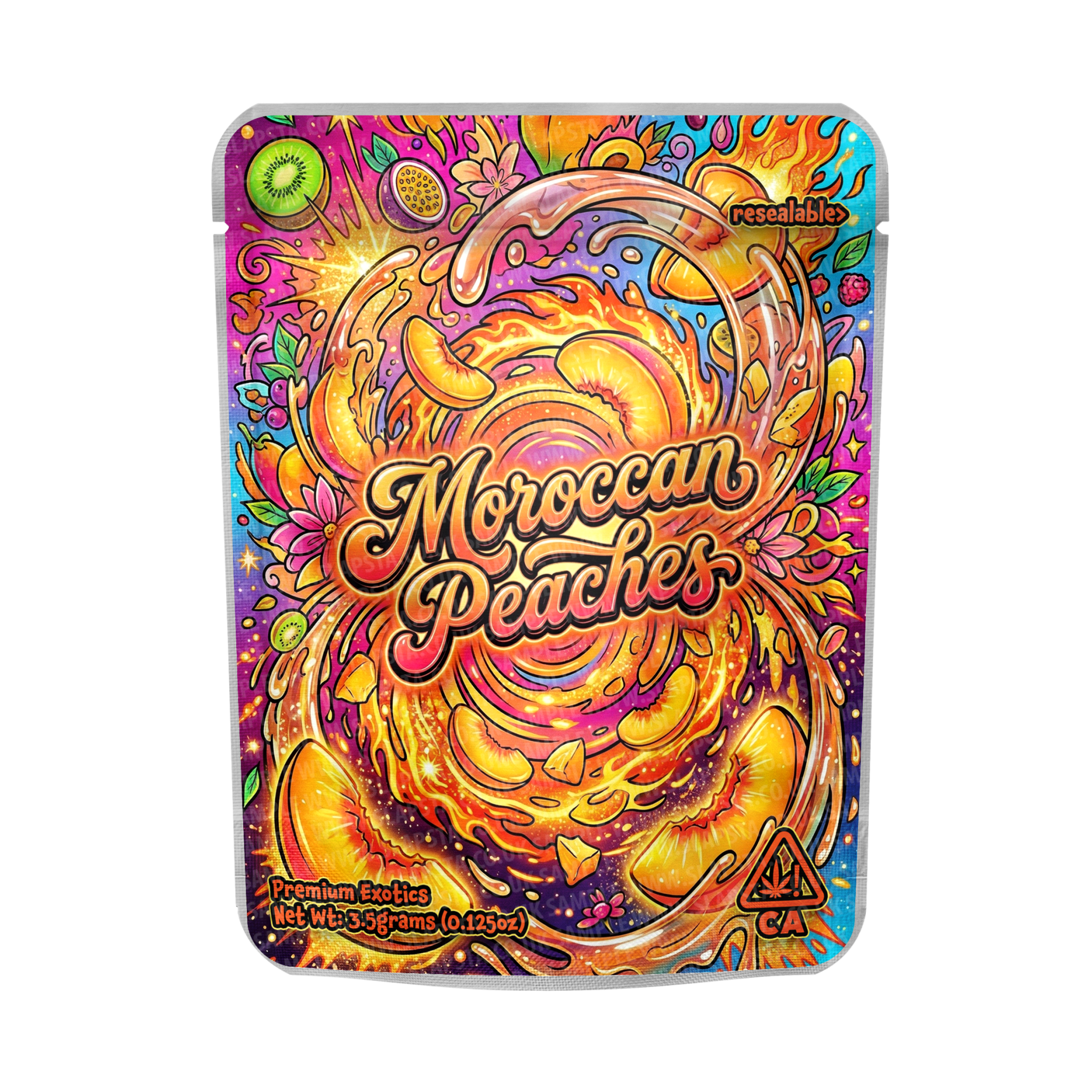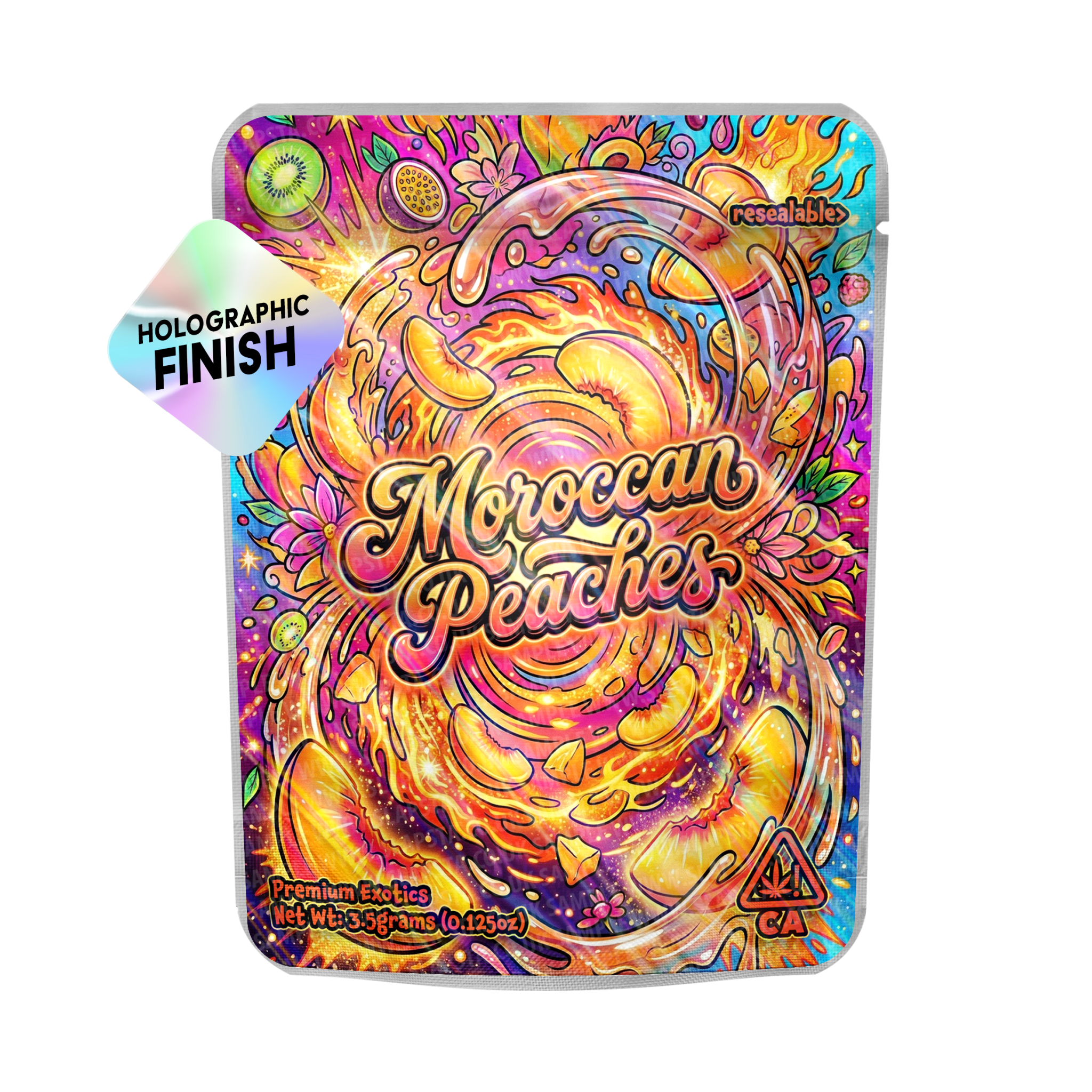 Resealable smell-proof mylar strain pouches with a Moroccan Peaches vinyl label professionally pre-applied for quick retail-ready packaging.