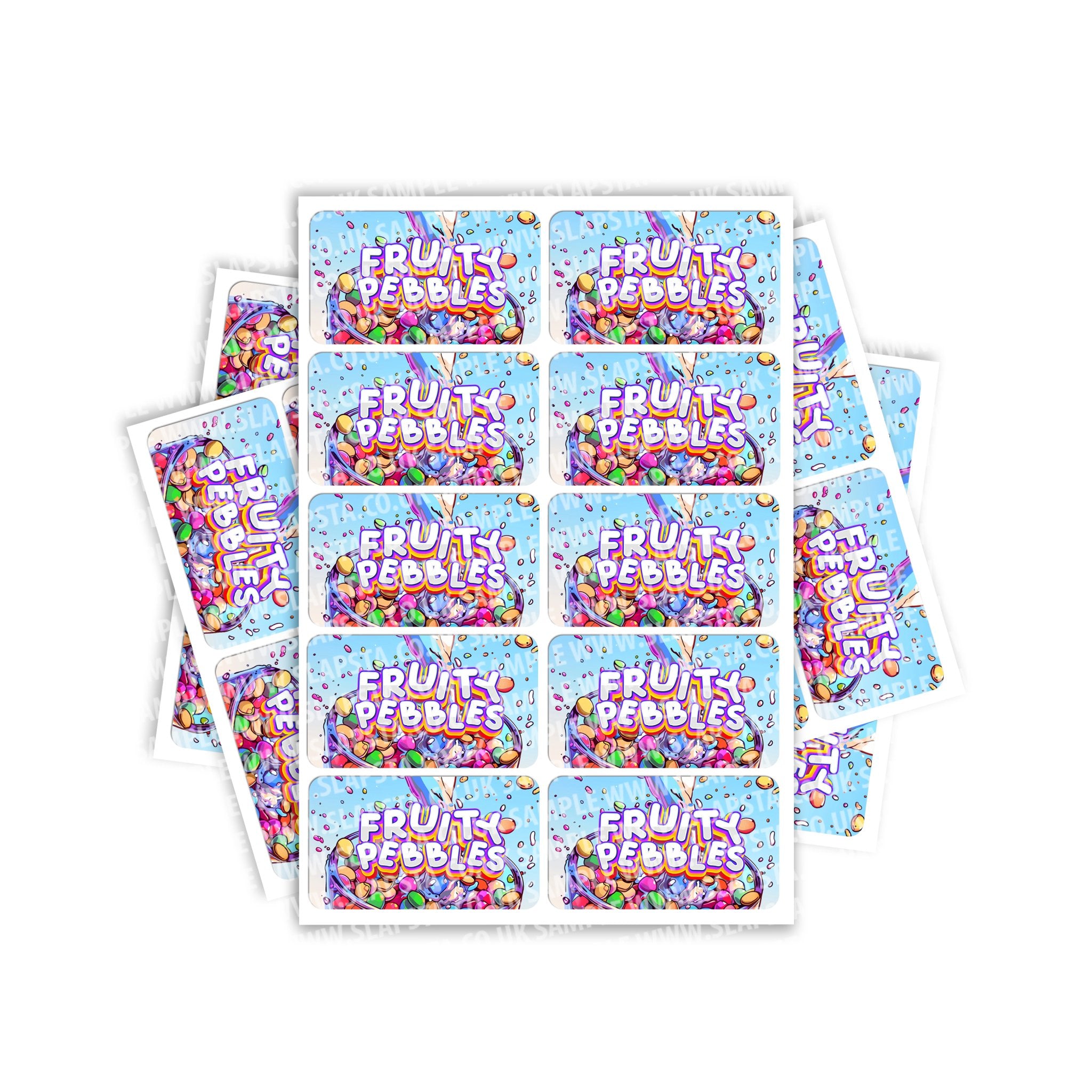 Fruity Pebbles gloss vinyl sticker labels. Please choose the size and quantity you require. For help sizing, please view the size guide image or use the measurements provided.