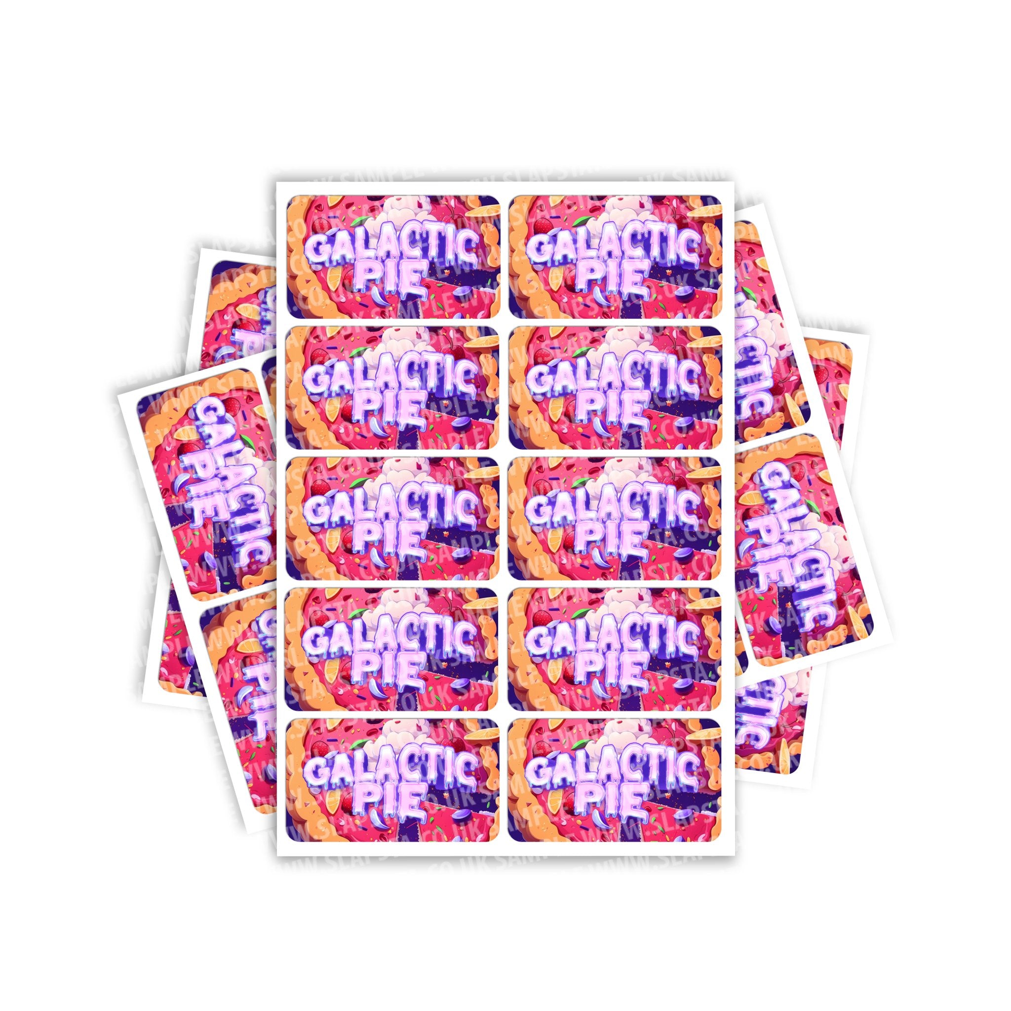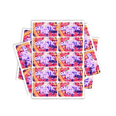Galactic Pie gloss vinyl sticker labels. Please choose the size and quantity you require. For help sizing, please view the size guide image or use the measurements provided.