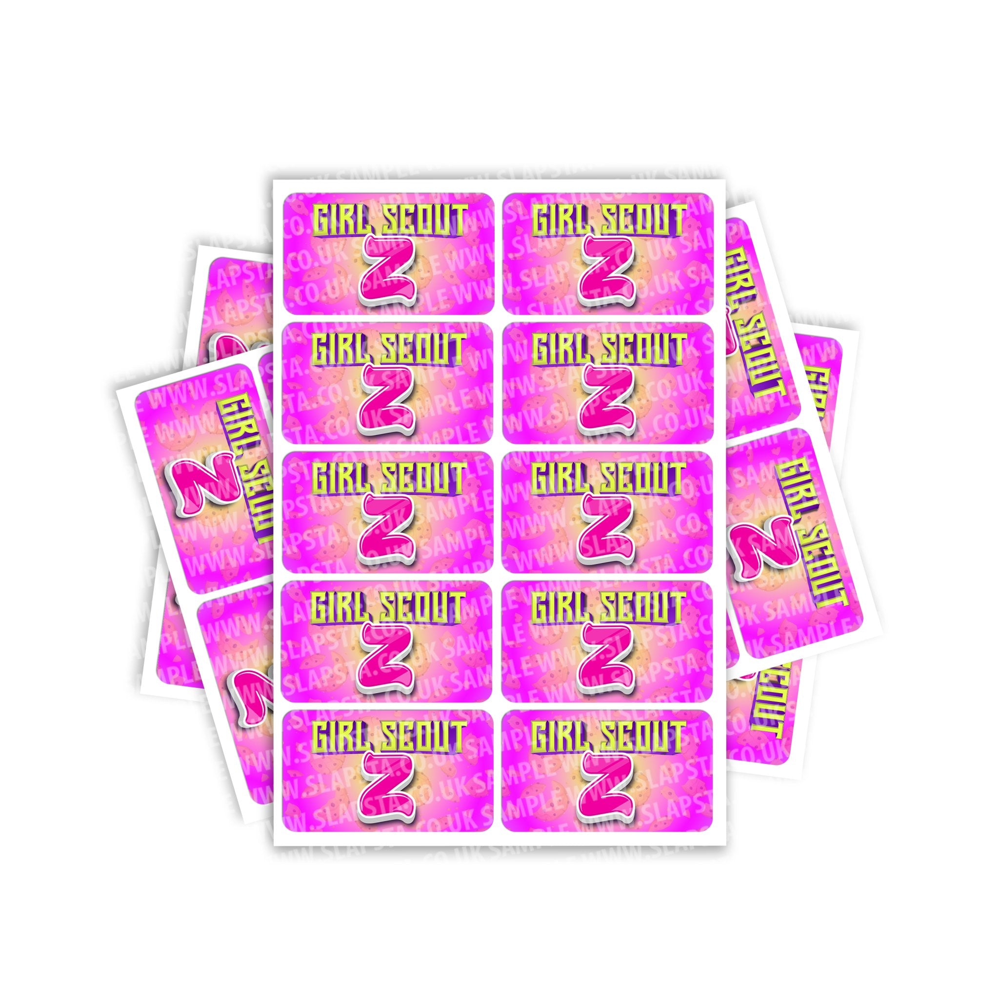 Girl Scoutz gloss vinyl sticker labels. Please choose the size and quantity you require. For help sizing, please view the size guide image or use the measurements provided.