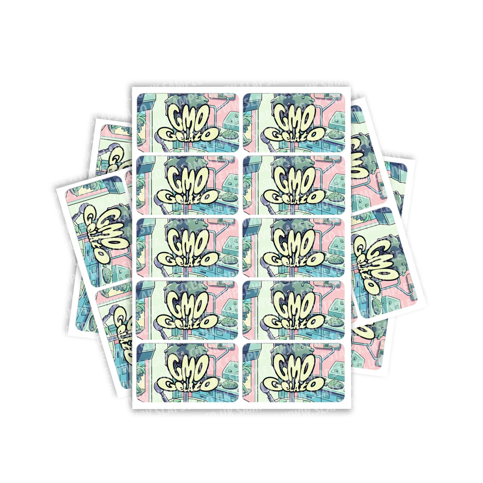GMO Gelato gloss vinyl sticker labels. Please choose the size and quantity you require. For help sizing, please view the size guide image or use the measurements provided.