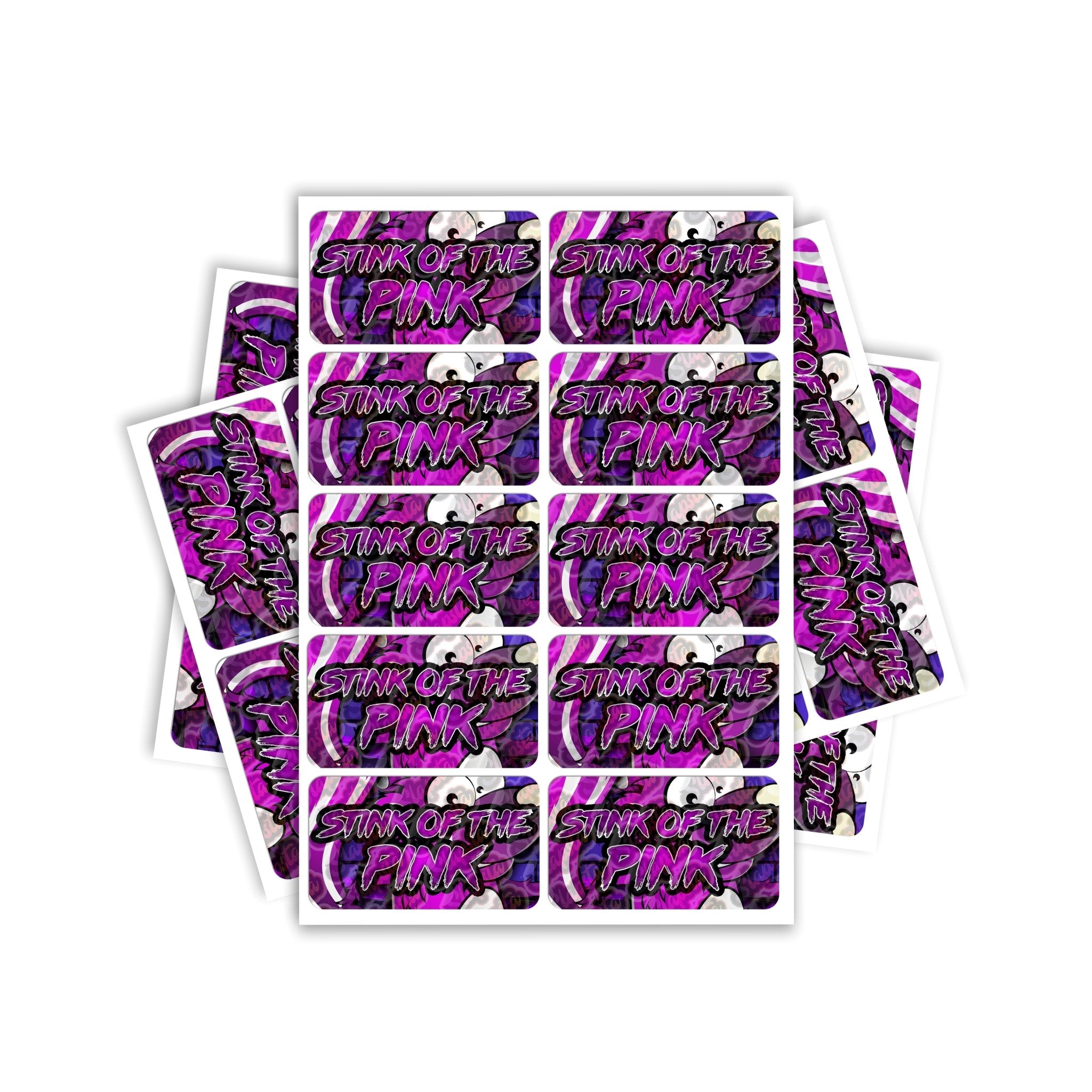 Stink Of The Pink gloss vinyl sticker labels. Please choose the size and quantity you require. For help sizing, please view the size guide image or use the measurements provided.