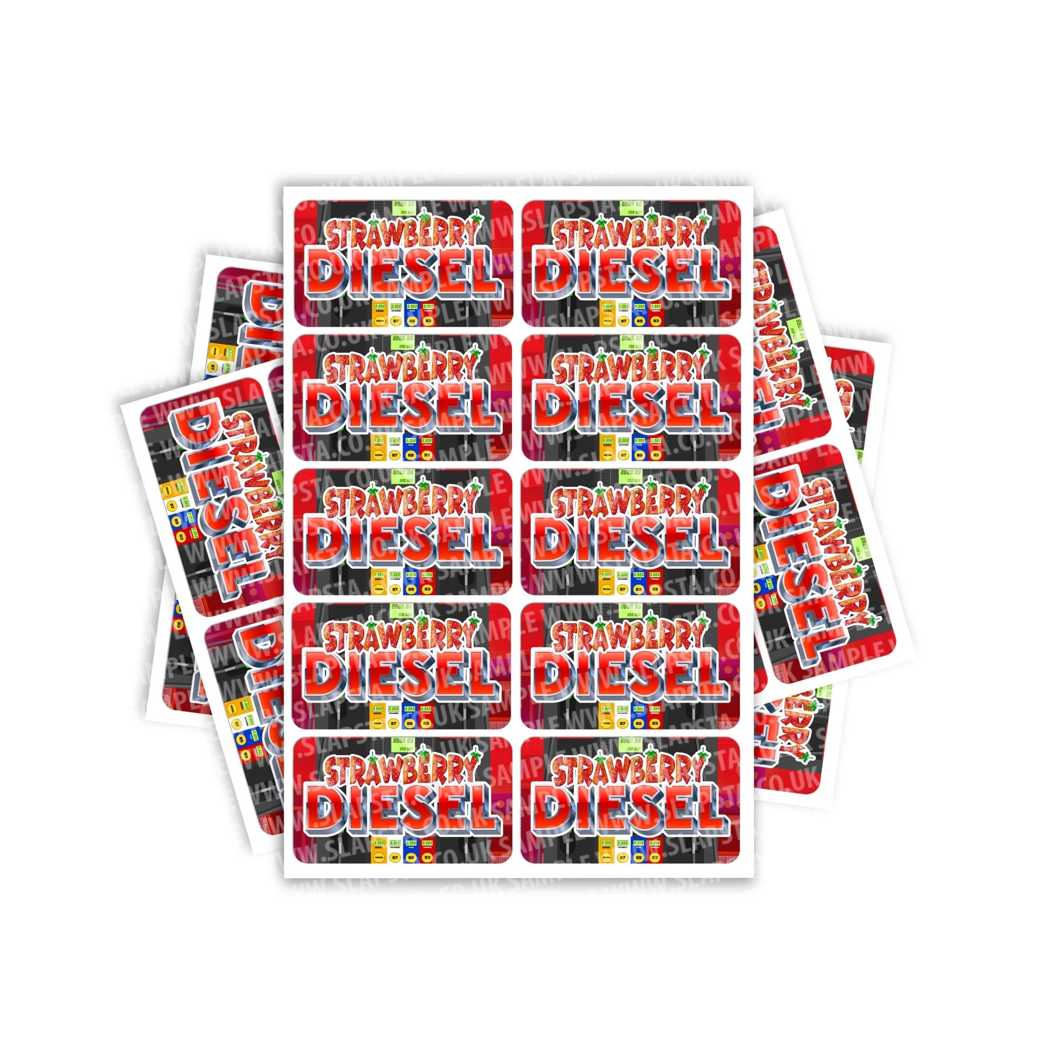 Strawberry Diesel gloss vinyl sticker labels. Please choose the size and quantity you require. For help sizing, please view the size guide image or use the measurements provided.