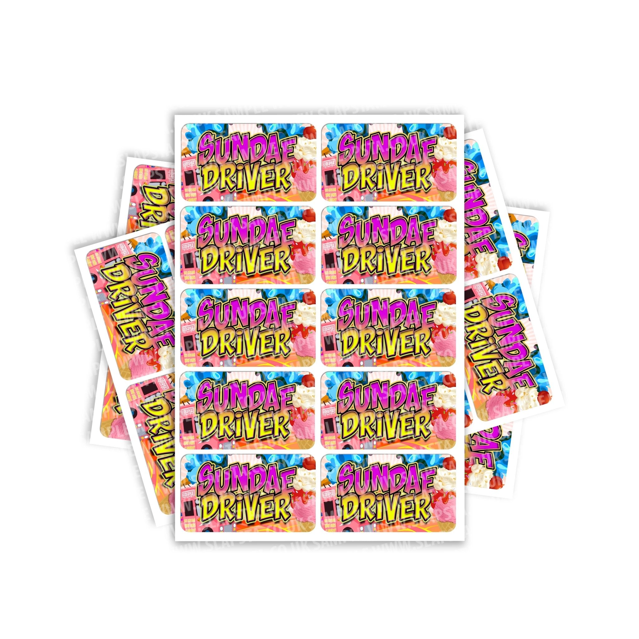 Sundae Driver gloss vinyl sticker labels. Please choose the size and quantity you require. For help sizing, please view the size guide image or use the measurements provided.