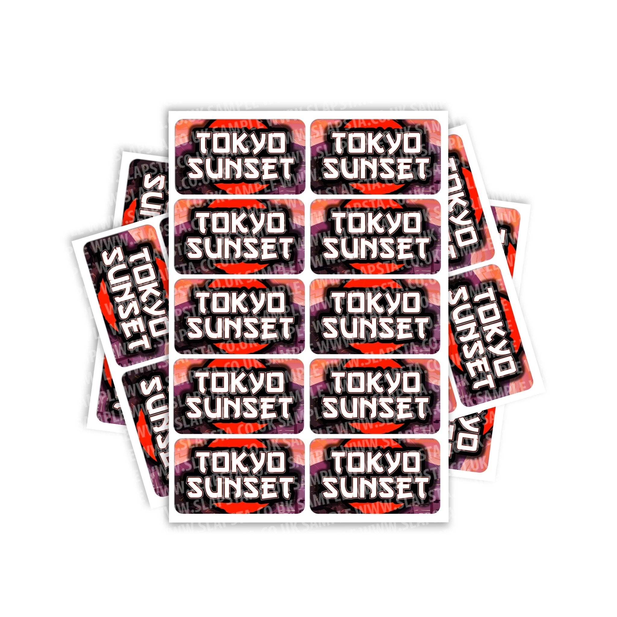 Tokyo Sunset gloss vinyl sticker labels. Please choose the size and quantity you require. For help sizing, please view the size guide image or use the measurements provided.