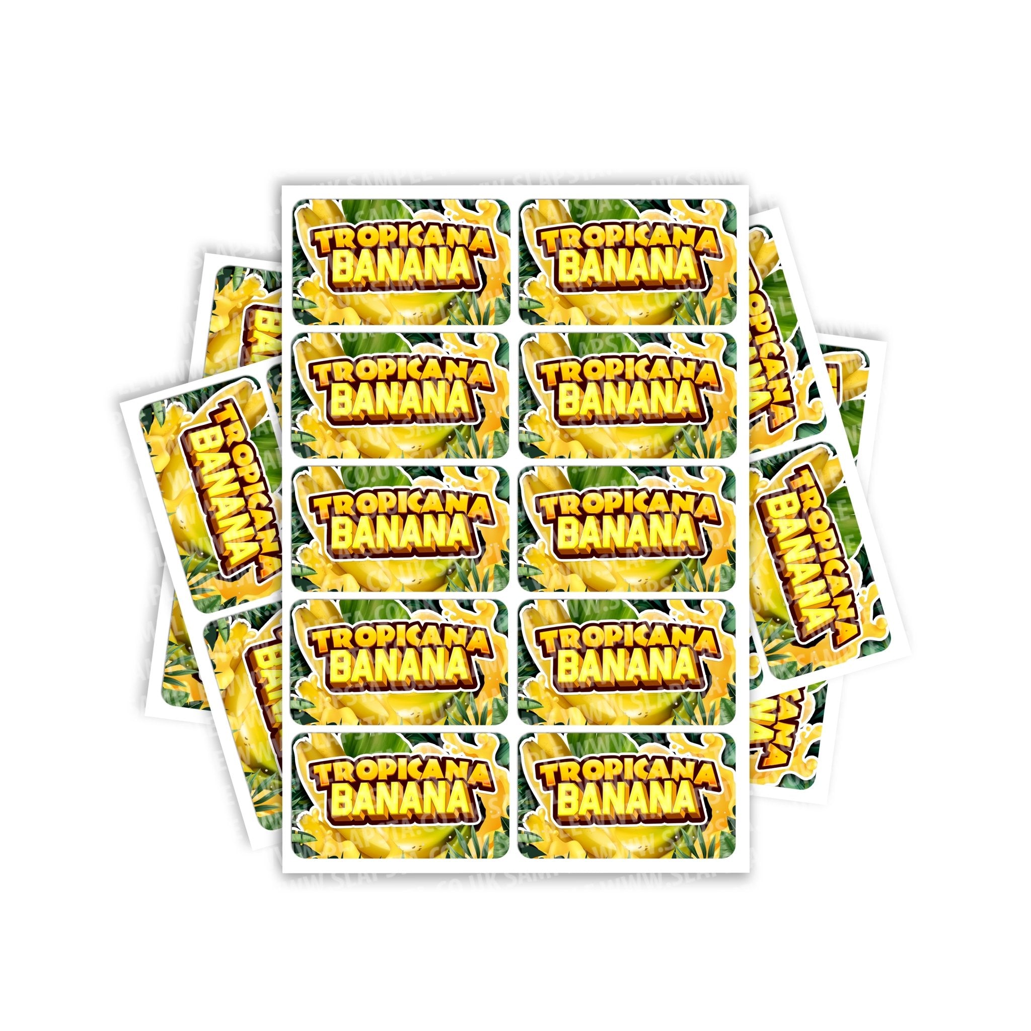 Tropicana Banana gloss vinyl sticker labels. Please choose the size and quantity you require. For help sizing, please view the size guide image or use the measurements provided.