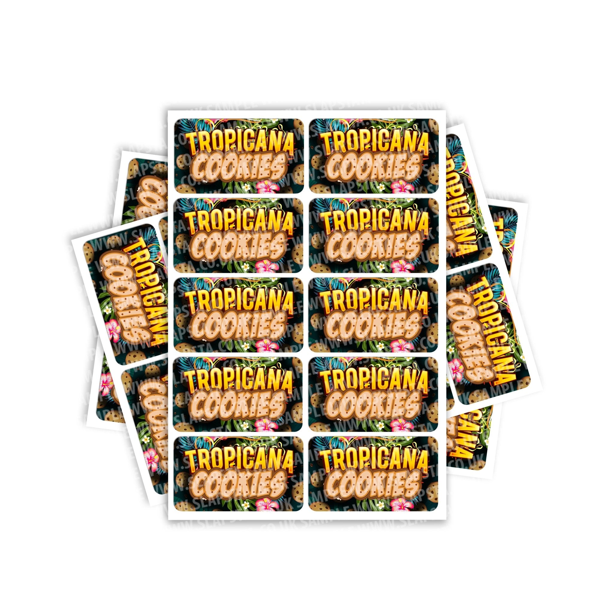 Tropicana Cookies gloss vinyl sticker labels. Please choose the size and quantity you require. For help sizing, please view the size guide image or use the measurements provided.