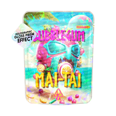 Resealable, smell-proof mylar pouches, with Bubblegum Mai Tai vinyl sticker pre-applied, in a matte holographic prism effect.