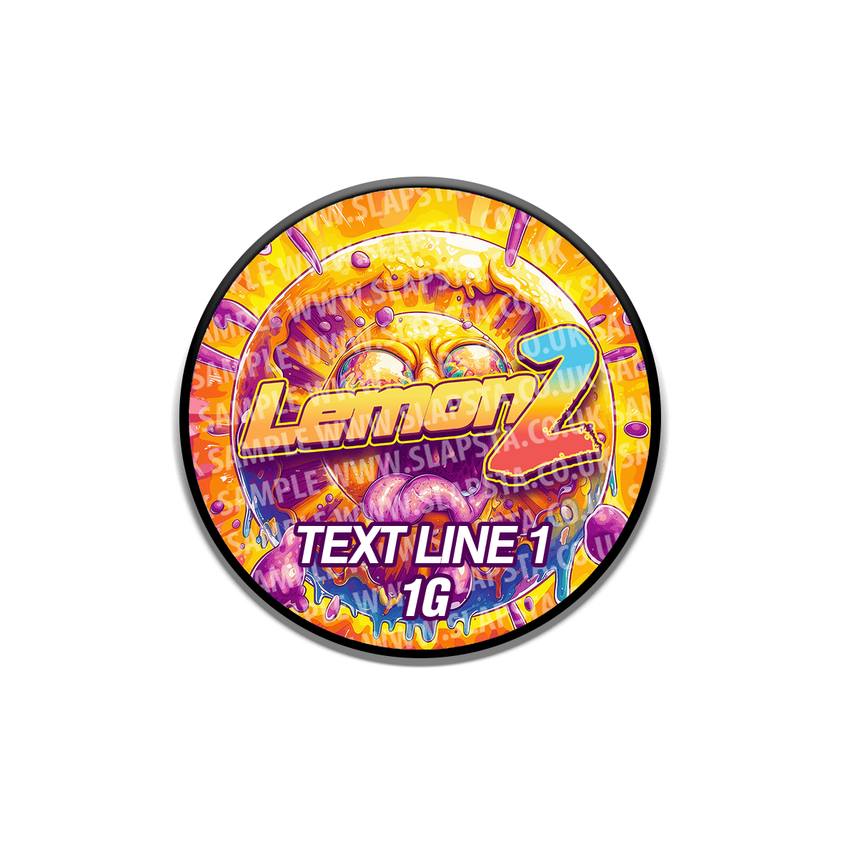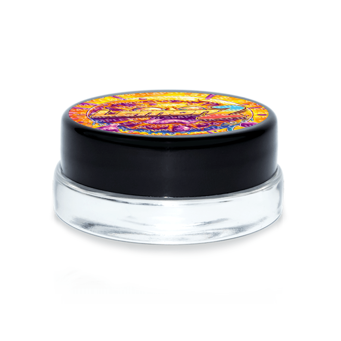 7ml clear glass concentrate jars, perfect for 1g-3.5g concentrate / extract, with black screw top plastic lids, and printed vinyl 'Lemon Z' (Previously Known as Lemon ZkittleZ) labels applied.