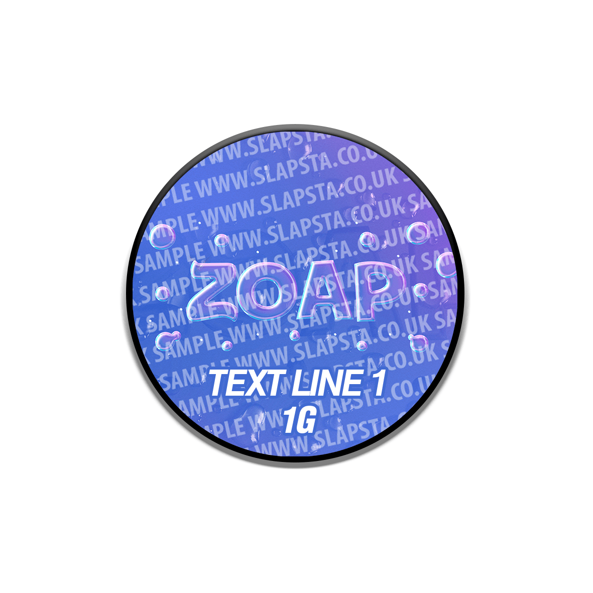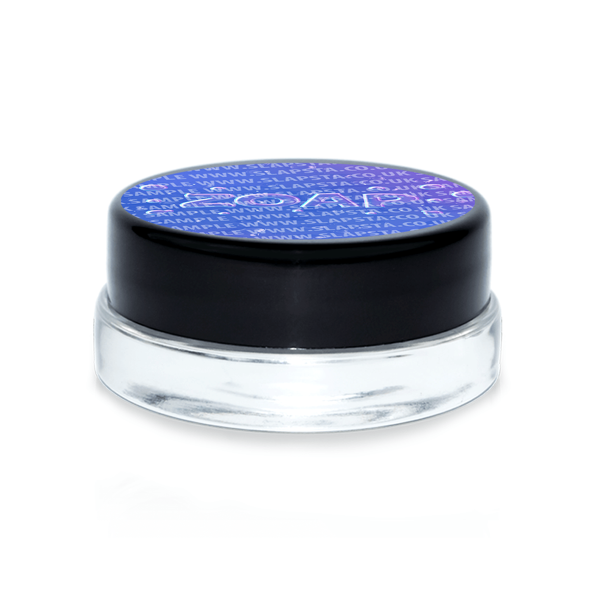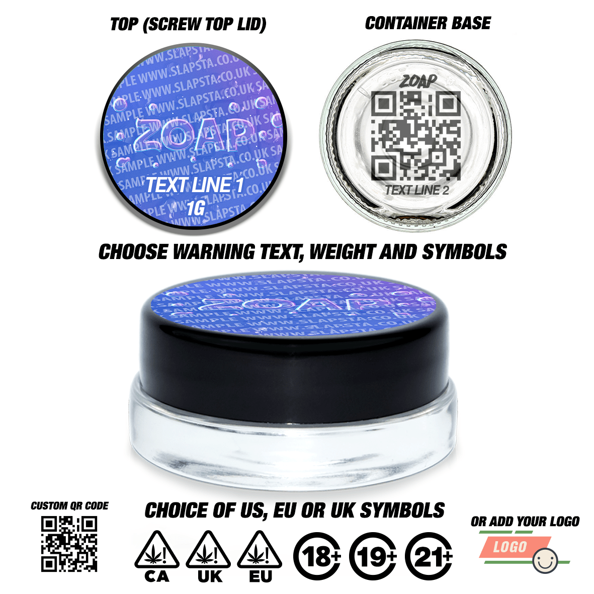7ml clear glass concentrate jars, perfect for 1g-3.5g concentrate / extract, with black screw top plastic lids, and printed vinyl 'Zoap' labels applied.