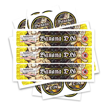 Ready-made Banana OG strain labels, available to fit our JAR and TAMPER STRIP POT Range. If you require your labels made to a certain size, please contact us. For bespoke designs, please check out our design section.