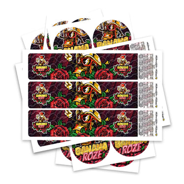 Ready-made Banana Roze strain labels, available to fit our JAR and TAMPER STRIP POT Range. If you require your labels made to a certain size, please contact us. For bespoke designs, please check out our design section.