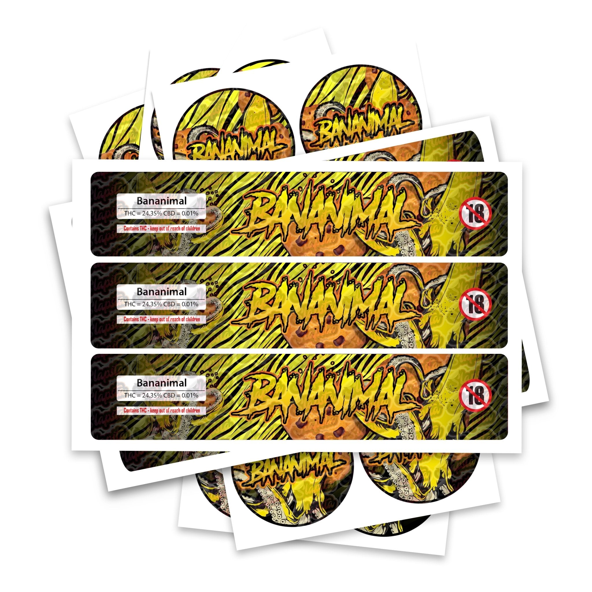 Ready-made Bananimal strain labels, available to fit our JAR and TAMPER STRIP POT Range. If you require your labels made to a certain size, please contact us. For bespoke designs, please check out our design section.