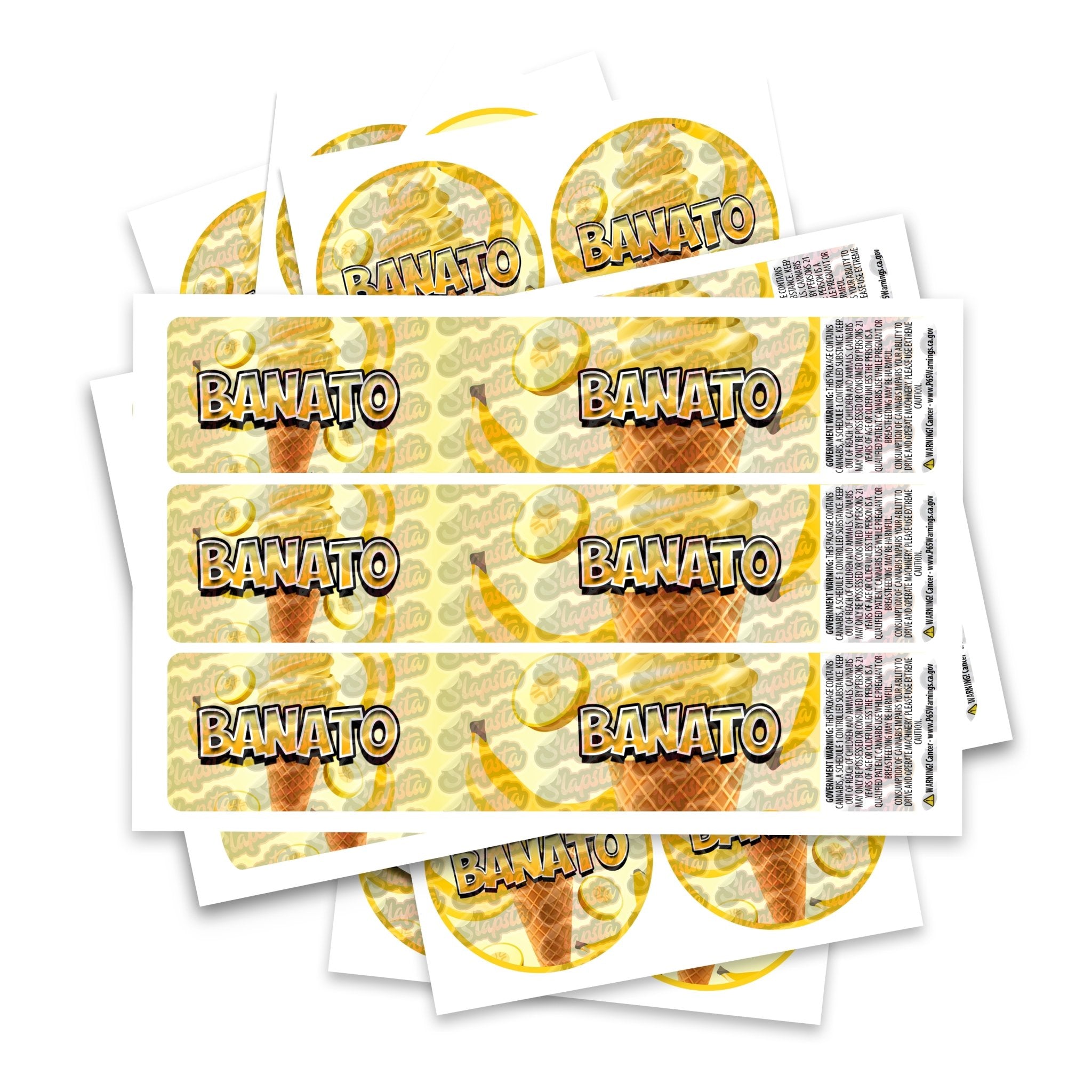 Ready-made Banato strain labels, available to fit our JAR and TAMPER STRIP POT Range. If you require your labels made to a certain size, please contact us. For bespoke designs, please check out our design section.
