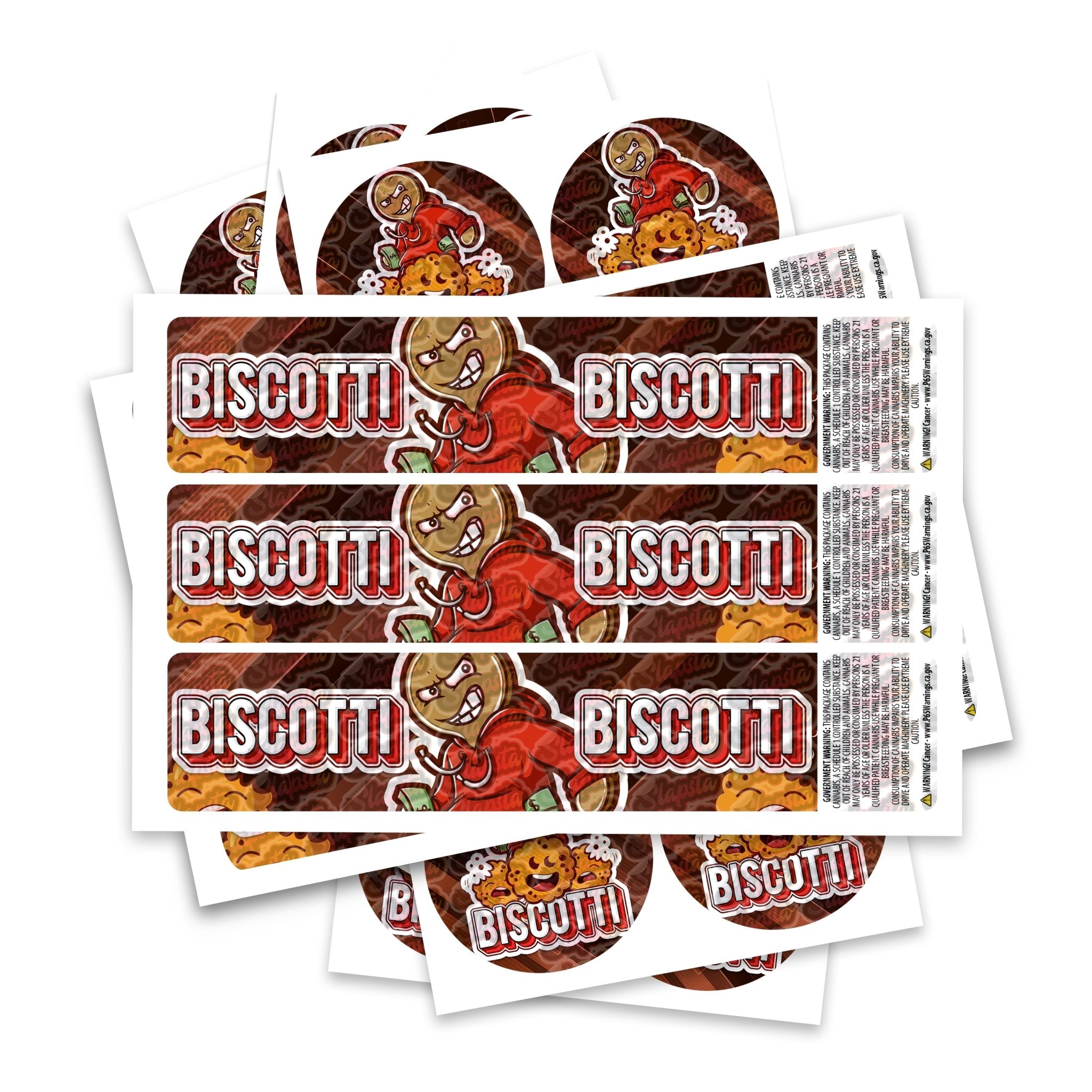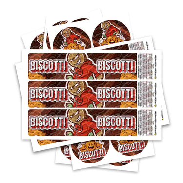 Ready-made Biscotti strain labels, available to fit our JAR and TAMPER STRIP POT Range. If you require your labels made to a certain size, please contact us. For bespoke designs, please check out our design section.