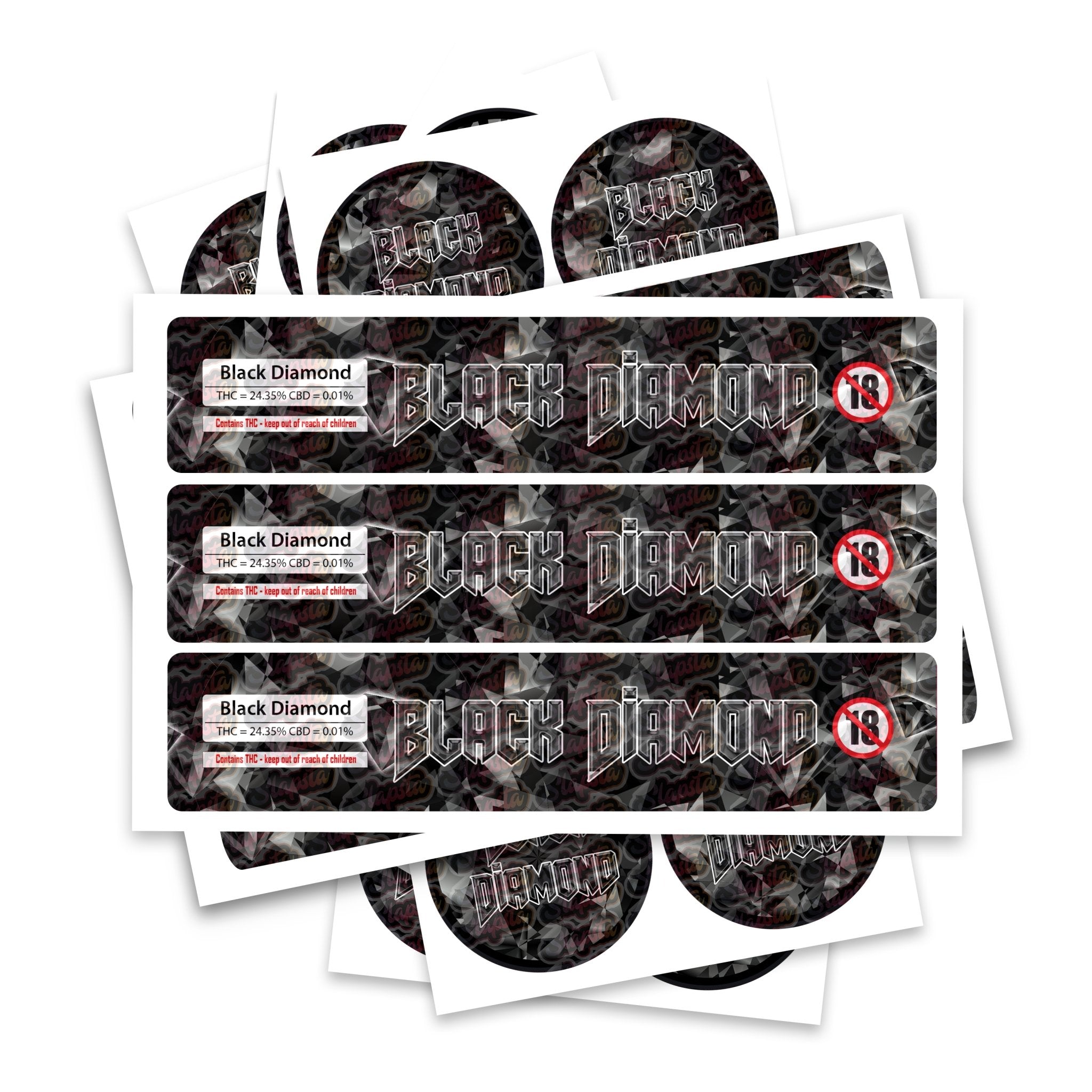 Ready-made Black Diamond strain labels, available to fit our JAR and TAMPER STRIP POT Range. If you require your labels made to a certain size, please contact us. For bespoke designs, please check out our design section.