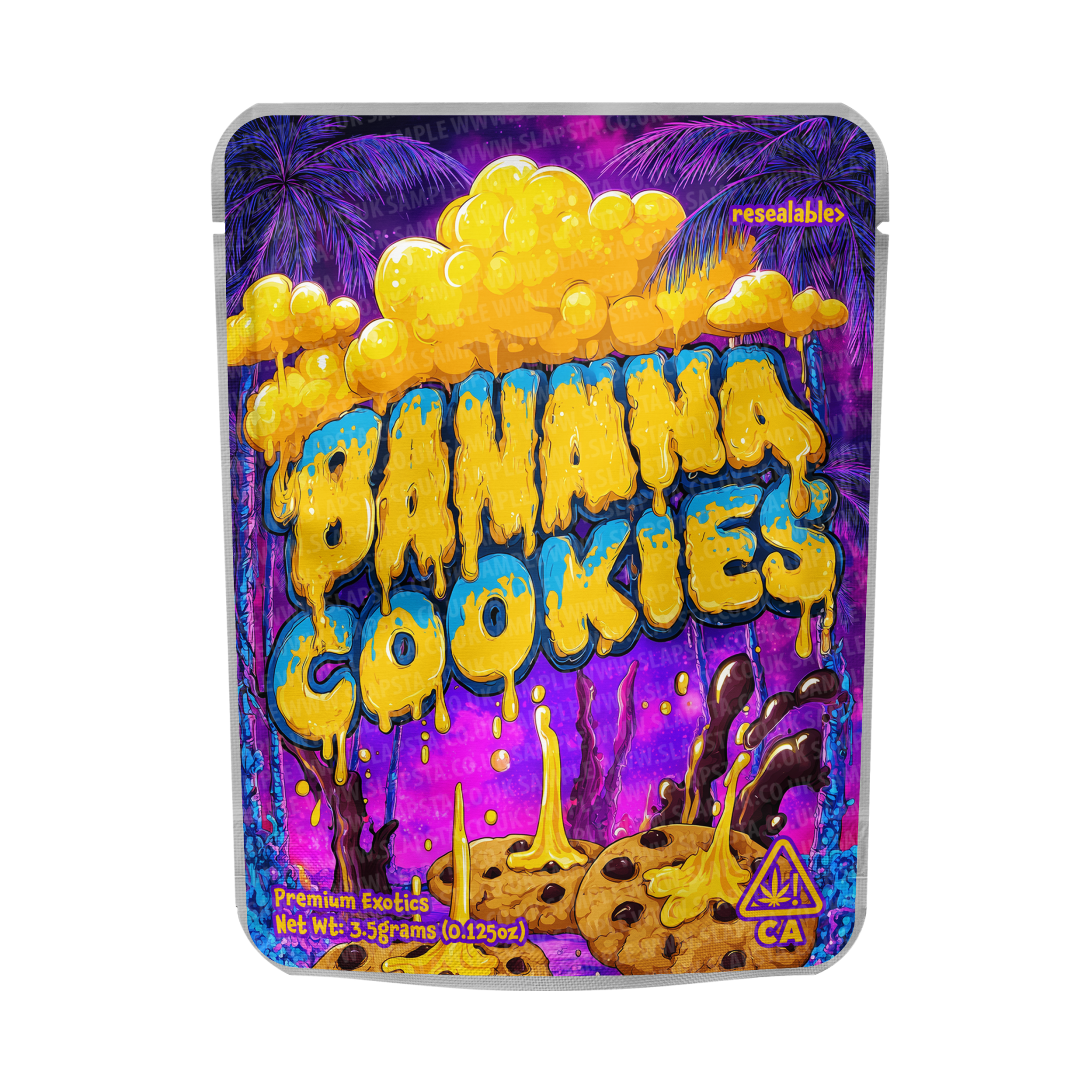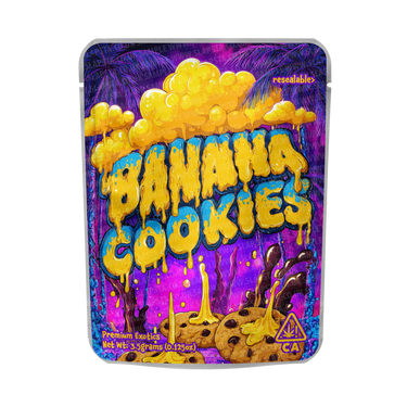 Resealable, smell-proof mylar pouches, with Banana Cookies vinyl sticker label pre-applied. Available in 3.5grams, 7grams, 14grams, and 28gram sizes, with child-resistant option.