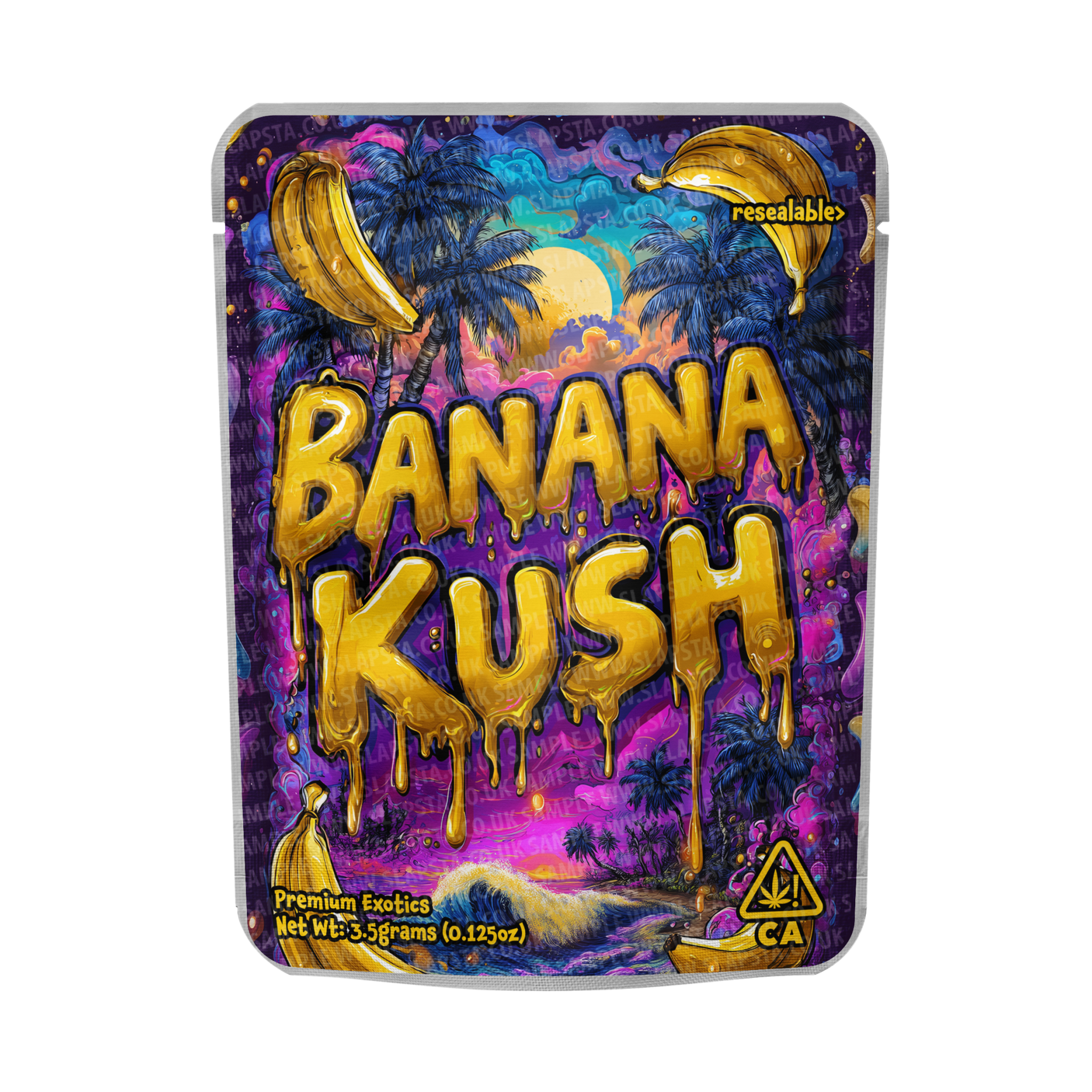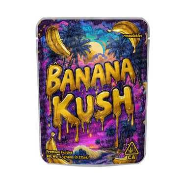 Resealable, smell-proof mylar pouches, with Banana Kush vinyl sticker label pre-applied. Available in 3.5grams, 7grams, 14grams, and 28gram sizes, with child-resistant option.