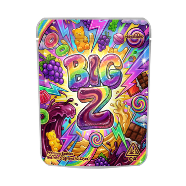 Resealable, smell-proof mylar pouches, with Big Z (Big Zkittlez) vinyl sticker pre-applied. Available in 3.5grams, 7grams, 14grams, and 28gram sizes, with child-resistant option.