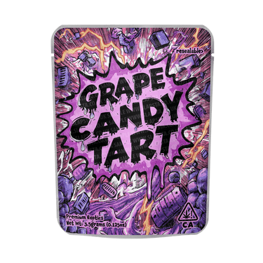 Resealable, smell-proof mylar pouches, with Grape Candy Tart vinyl sticker label pre-applied. Available in 3.5grams, 7grams, 14grams, and 28gram sizes, with child-resistant option.