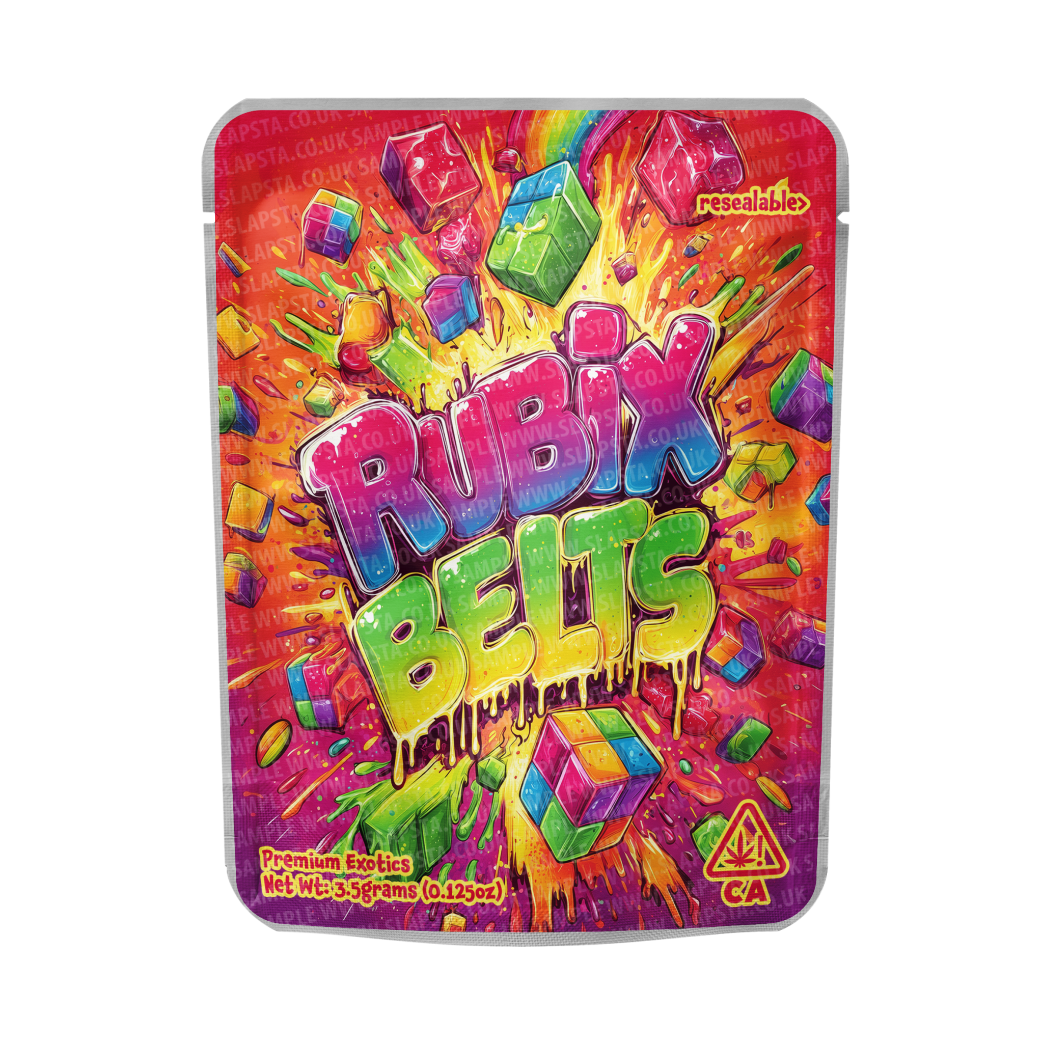 Resealable, smell-proof mylar pouches, with Rubix Belts vinyl sticker label pre-applied. Available in 3.5grams, 7grams, 14grams, and 28gram sizes, with child-resistant option.