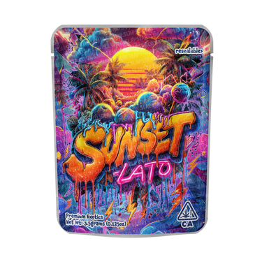 Resealable, smell-proof mylar pouches, with Sunset Lato vinyl sticker label pre-applied. Available in 3.5grams, 7grams, 14grams, and 28gram sizes, with child-resistant option.