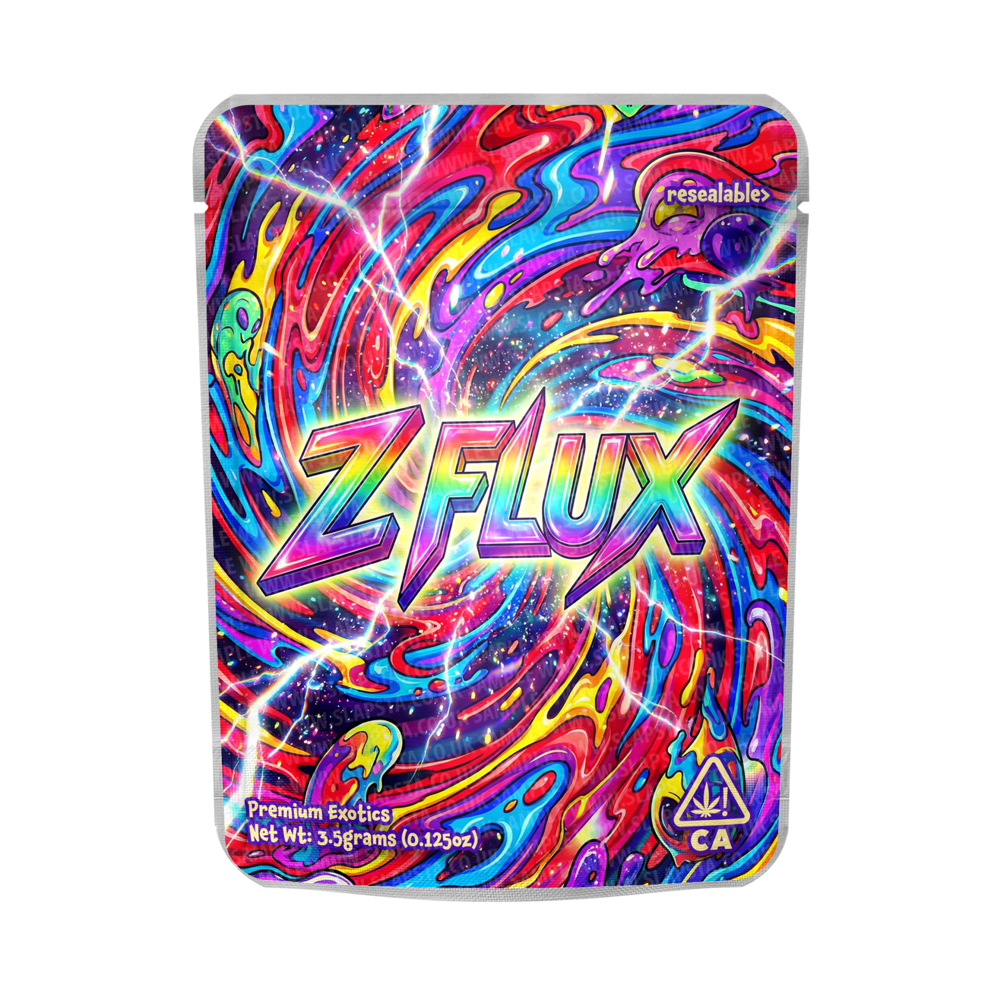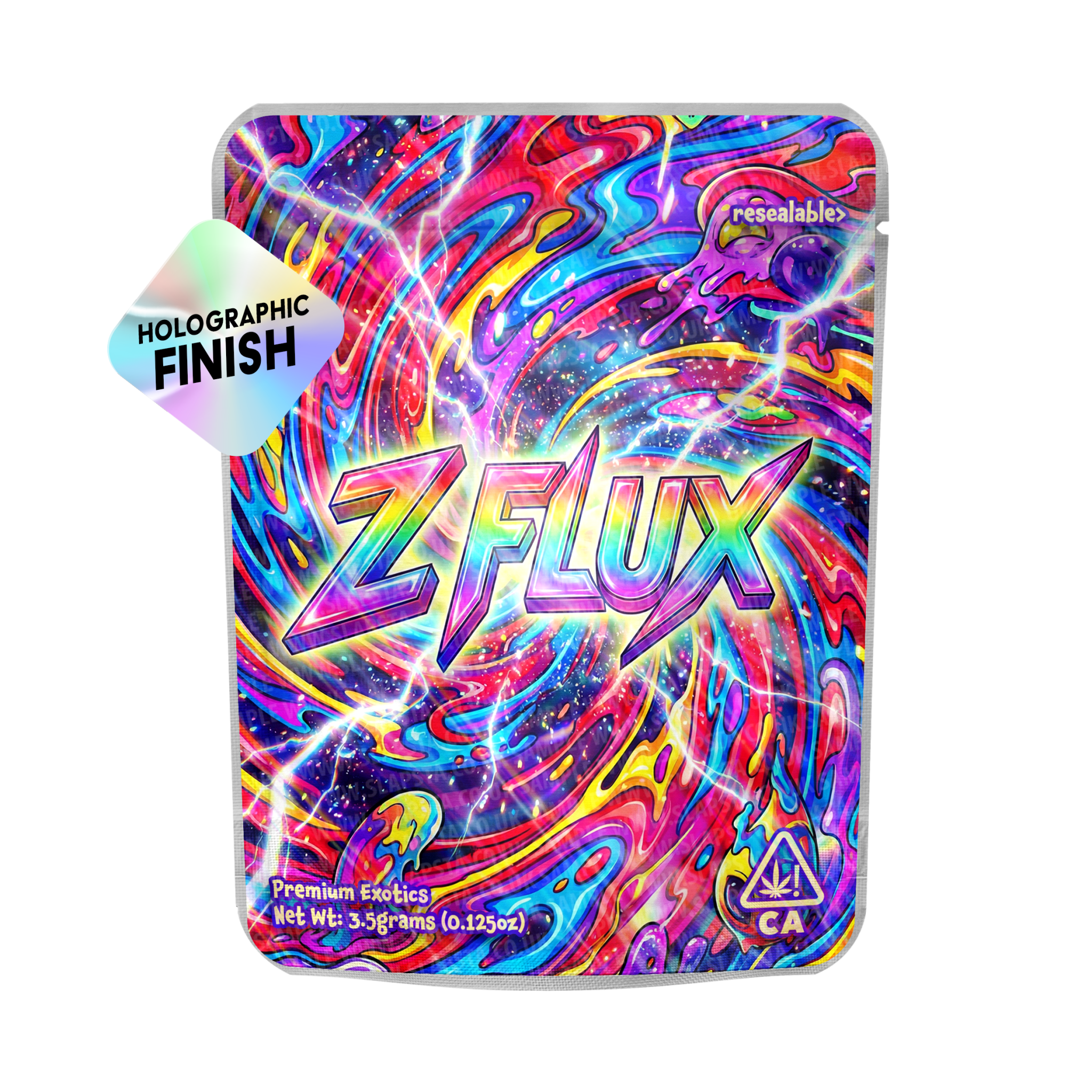 Resealable, smell-proof custom mylar strain bags with a full-size Z-Flux vinyl label professionally applied to one side.