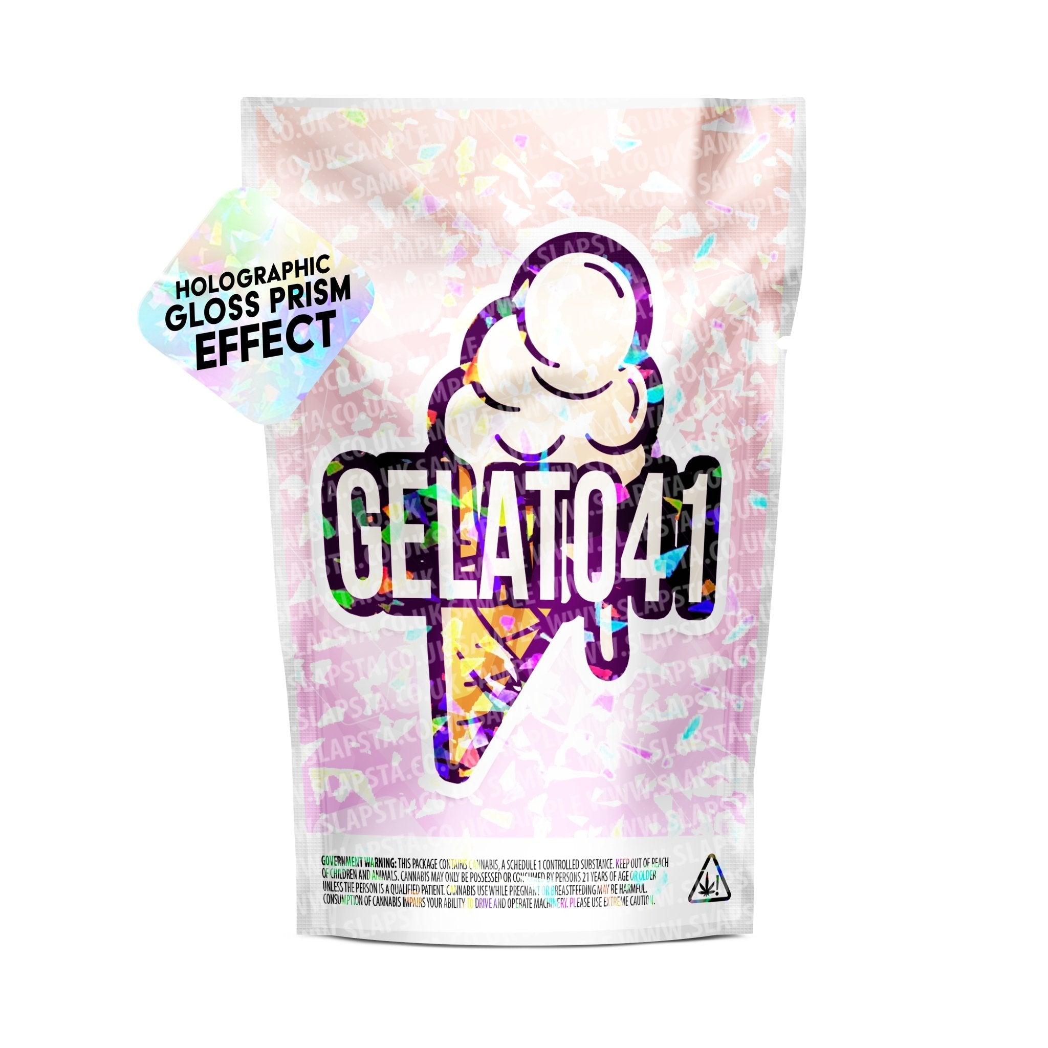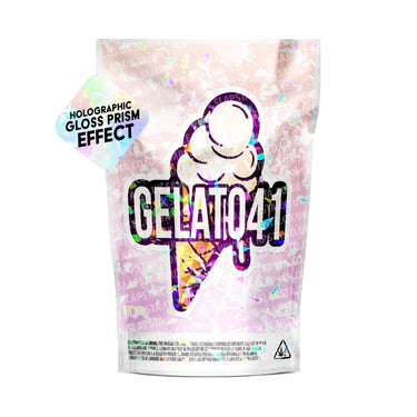 Resealable, smell-proof mylar pouches, with Gelato 41 vinyl sticker pre-applied, in a matte holographic prism effect.