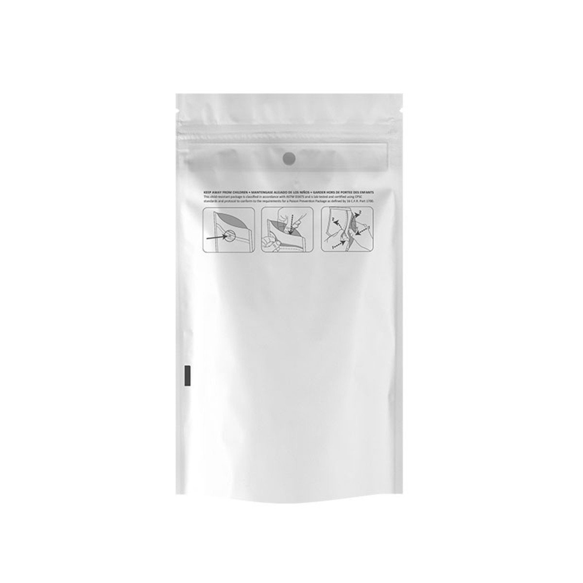 | Features | Tear notch, child-resistant zipper, heat sealable, bottom gusset |