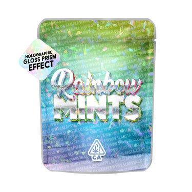 Sachets en mylar refermables et anti-odeurs, avec vinyle Rainbow Mintz autocollant pré-appliqué, à effet prisme holographique mat.
