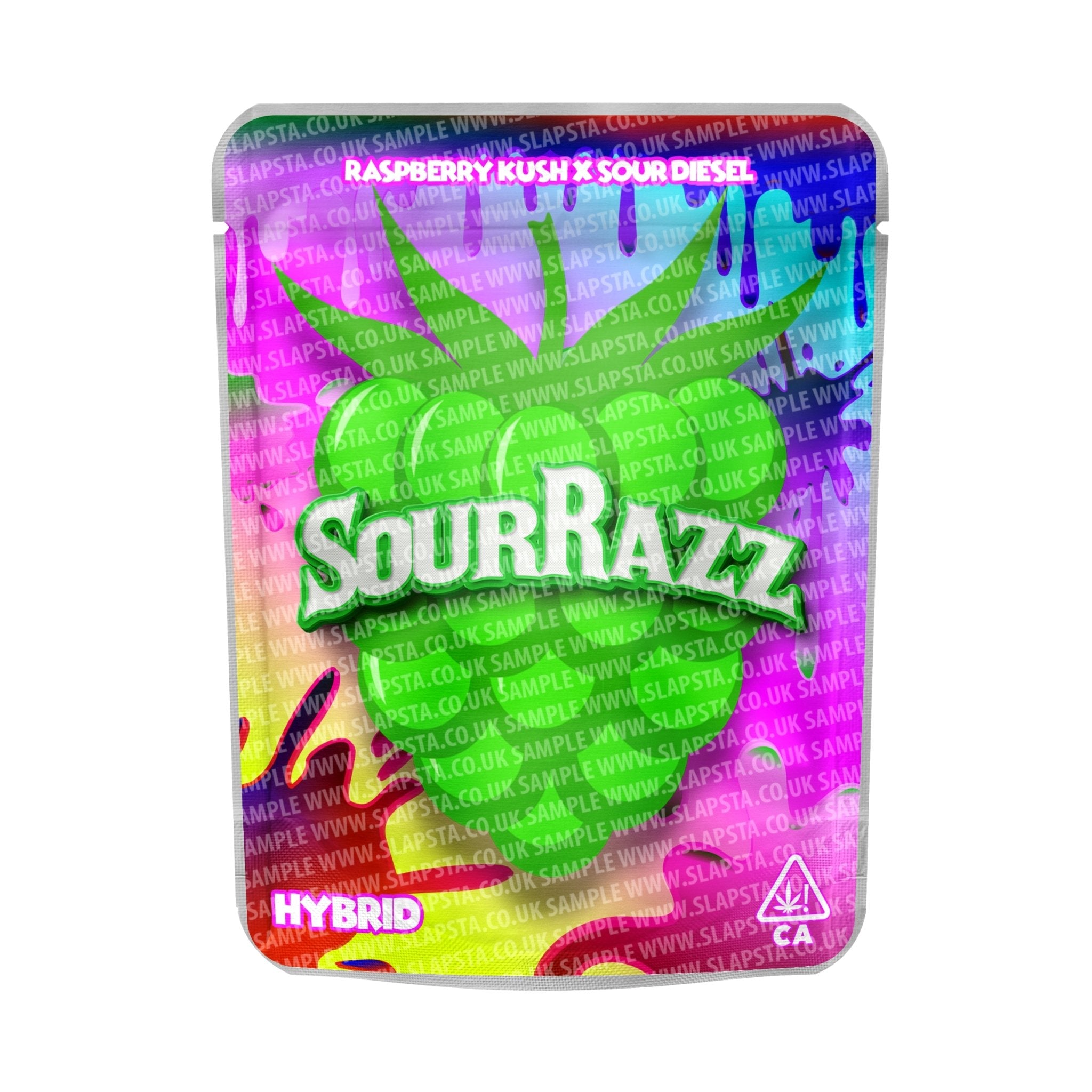 Sachets en mylar refermables et anti-odeurs, avec vinyle Sour Razz autocollant pré-appliqué. Disponible en 3,5 grammes , 7 grammes , 14 grammes et 28 grammes tailles, avec à l'épreuve des enfants option.