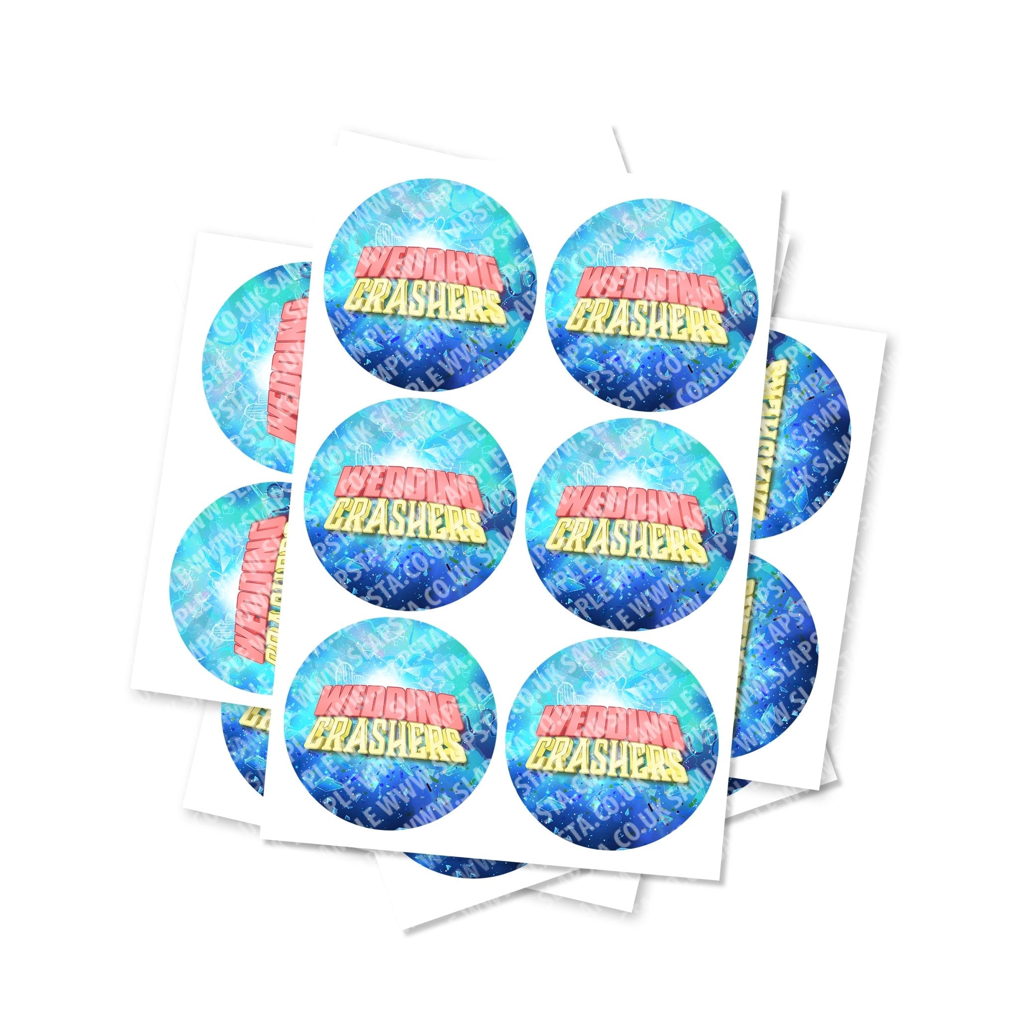 Autocollants circulaires en vinyle brillant de haute qualité pour Wedding Crasher. Veuillez choisir la taille et la quantité dont vous avez besoin dans le menu déroulant.