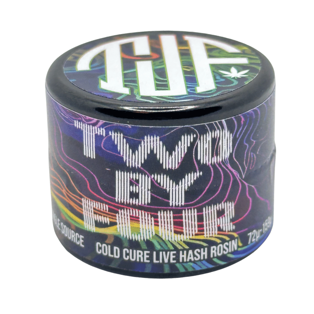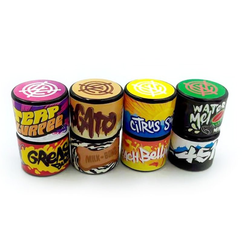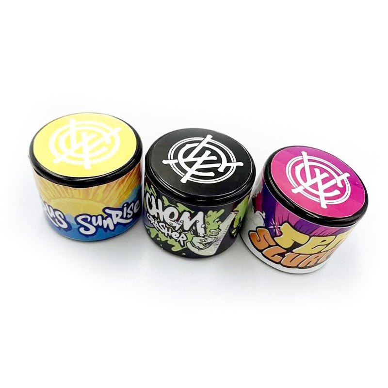 Pots de concentré en verre de 10 ml, avec couvercles en plastique à vis noirs et étiquettes en vinyle imprimées appliquées. Parfait pour les extraits, le shatter et la cire.