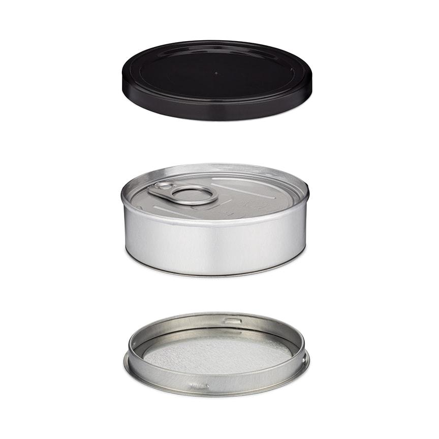 La boîte peut être fermée à la maison avec vos seules mains ! Une fois l'anneau retiré, elle peut être refermée avec le bouchon en plastique, pour conserver la fraîcheur de votre produit ! Disponible avec des bouchons en plastique noirs, transparents ou blancs.