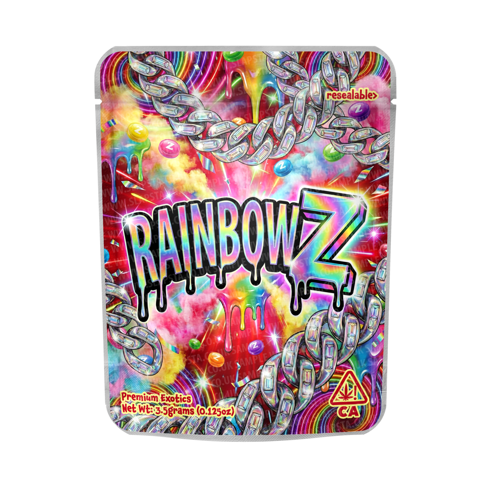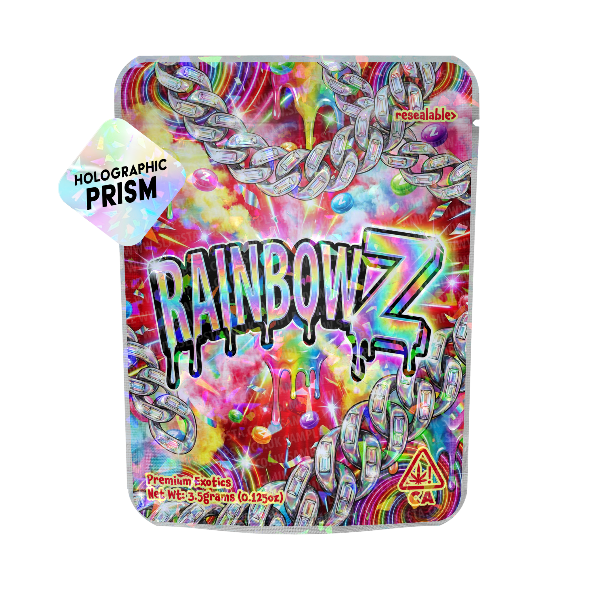 Resealable, smell-proof mylar pouches with a Rainbow Gelato vinyl label professionally pre-applied.