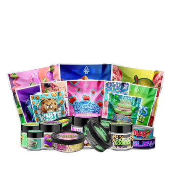Mylars pré-étiquetés, boîtes à anneau auto-obturantes et bocaux en verre dans une variété de modèles et de tailles.