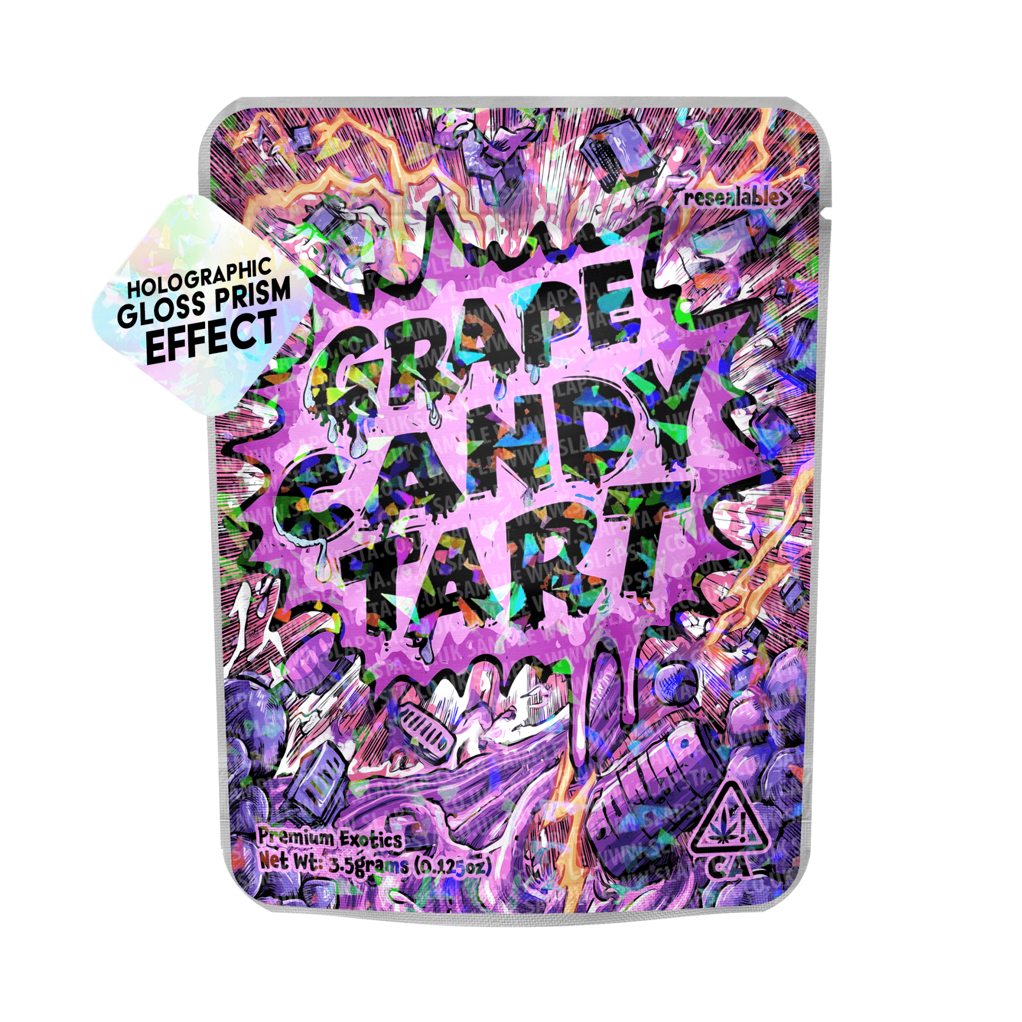Resealable, smell-proof mylar pouches, with Grape Candy Tart vinyl sticker pre-applied, in a holographic prism effect.