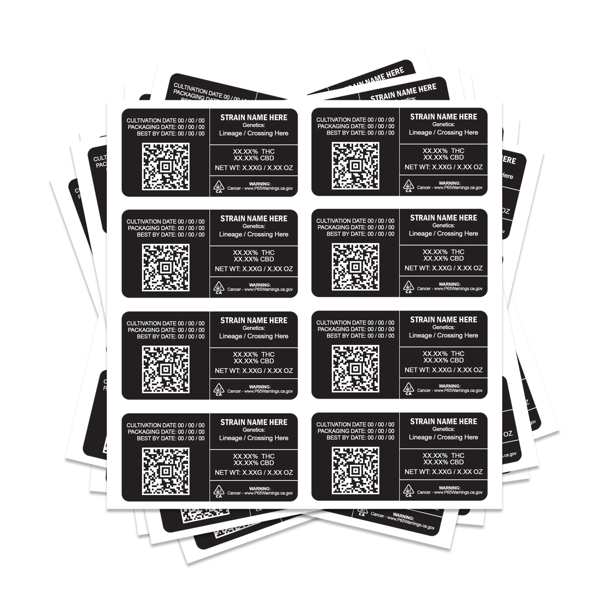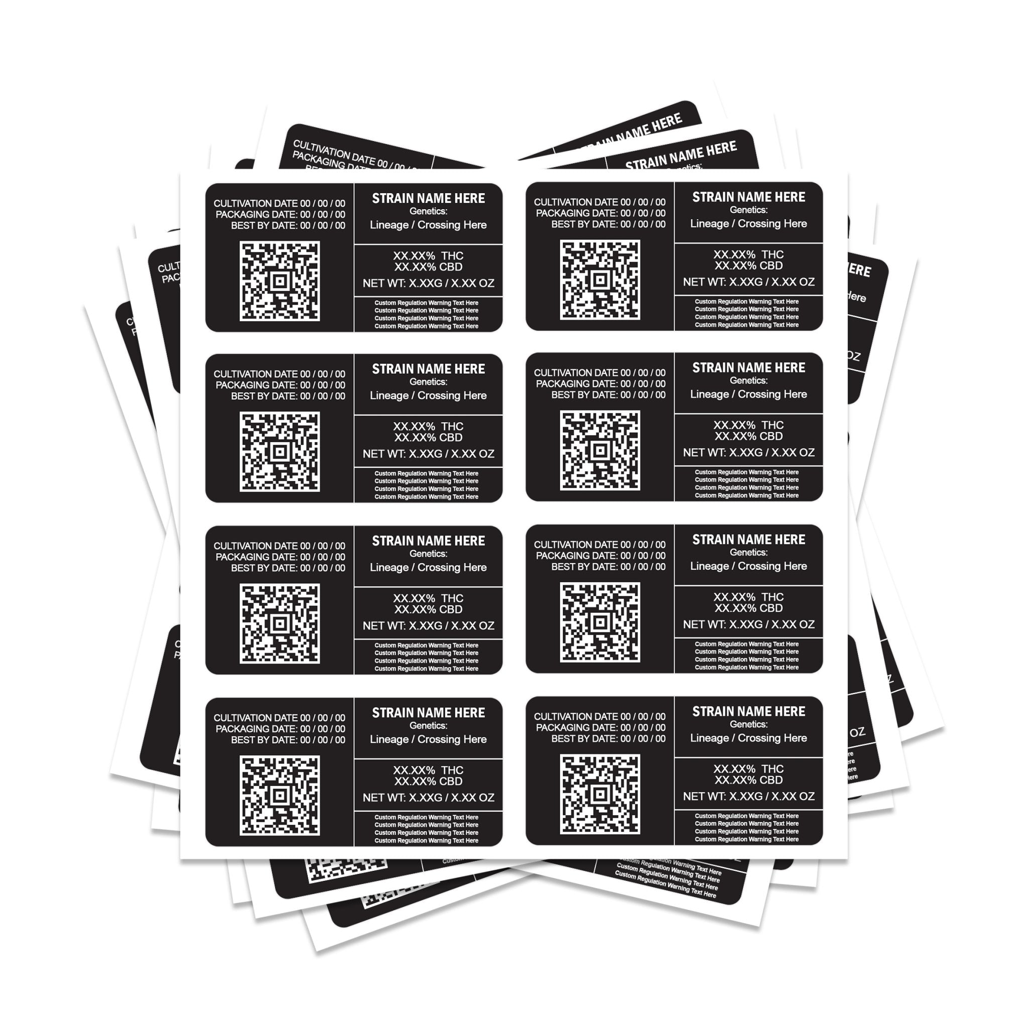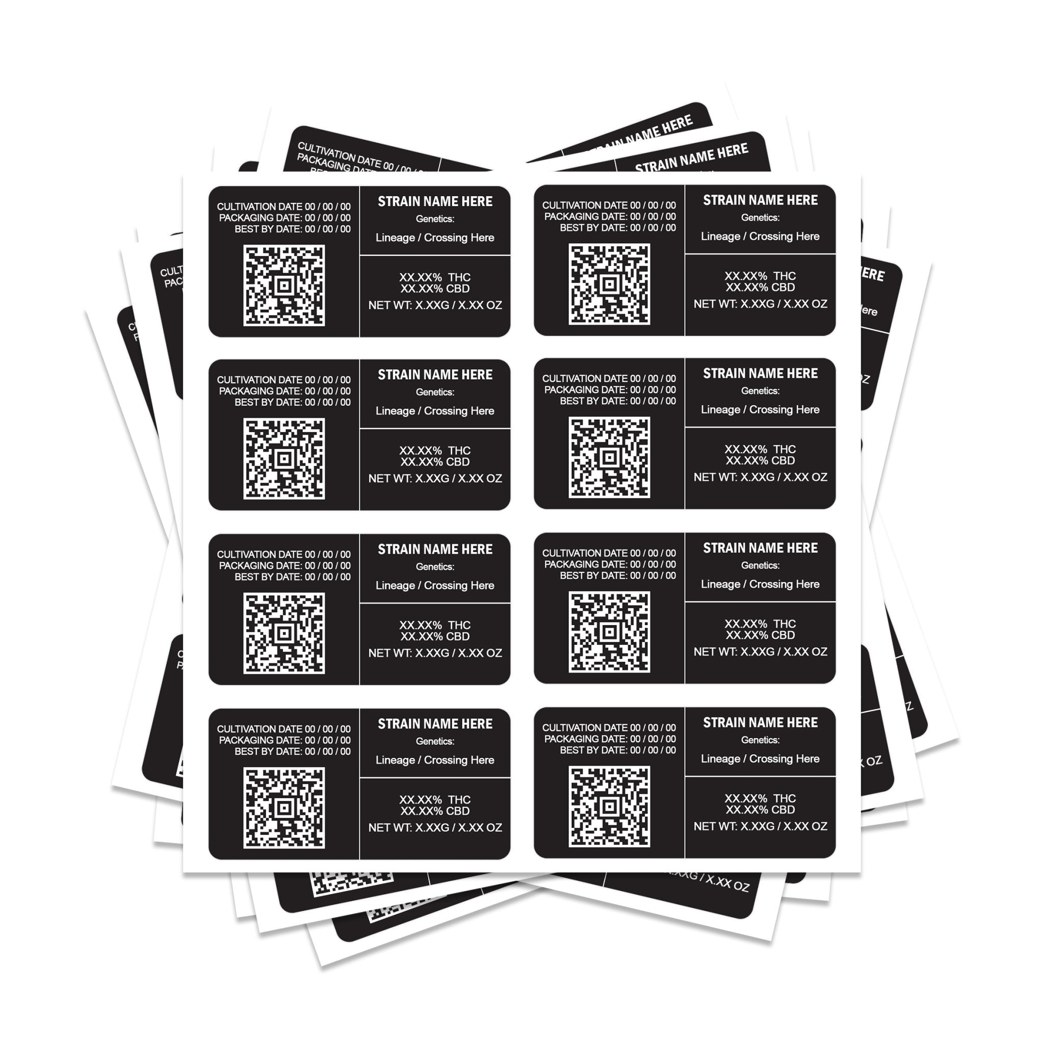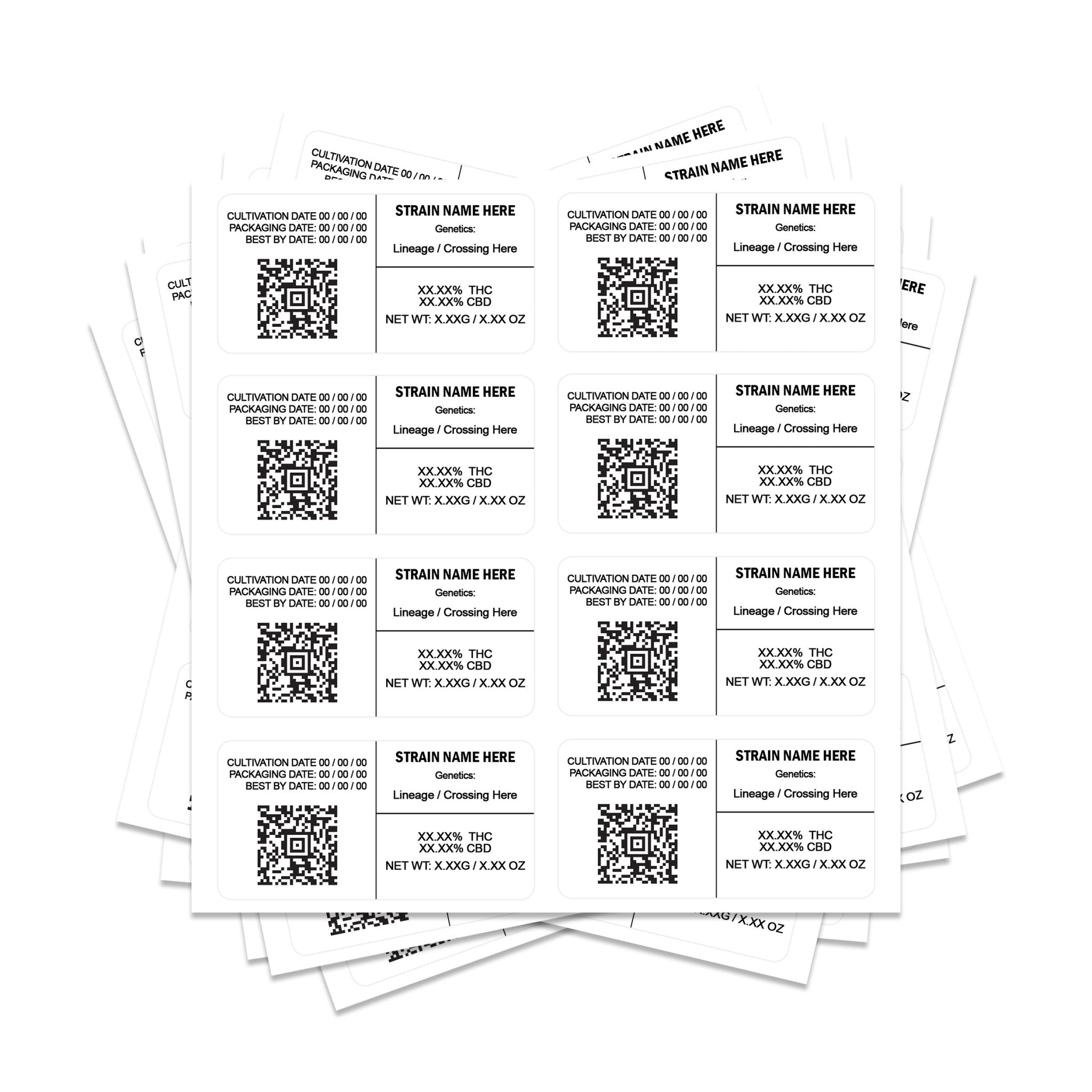 Étiquettes de tension QR rectangulaires 8x4 cm, parfaites pour les sacs mylar de 3,5 g et 7 g.