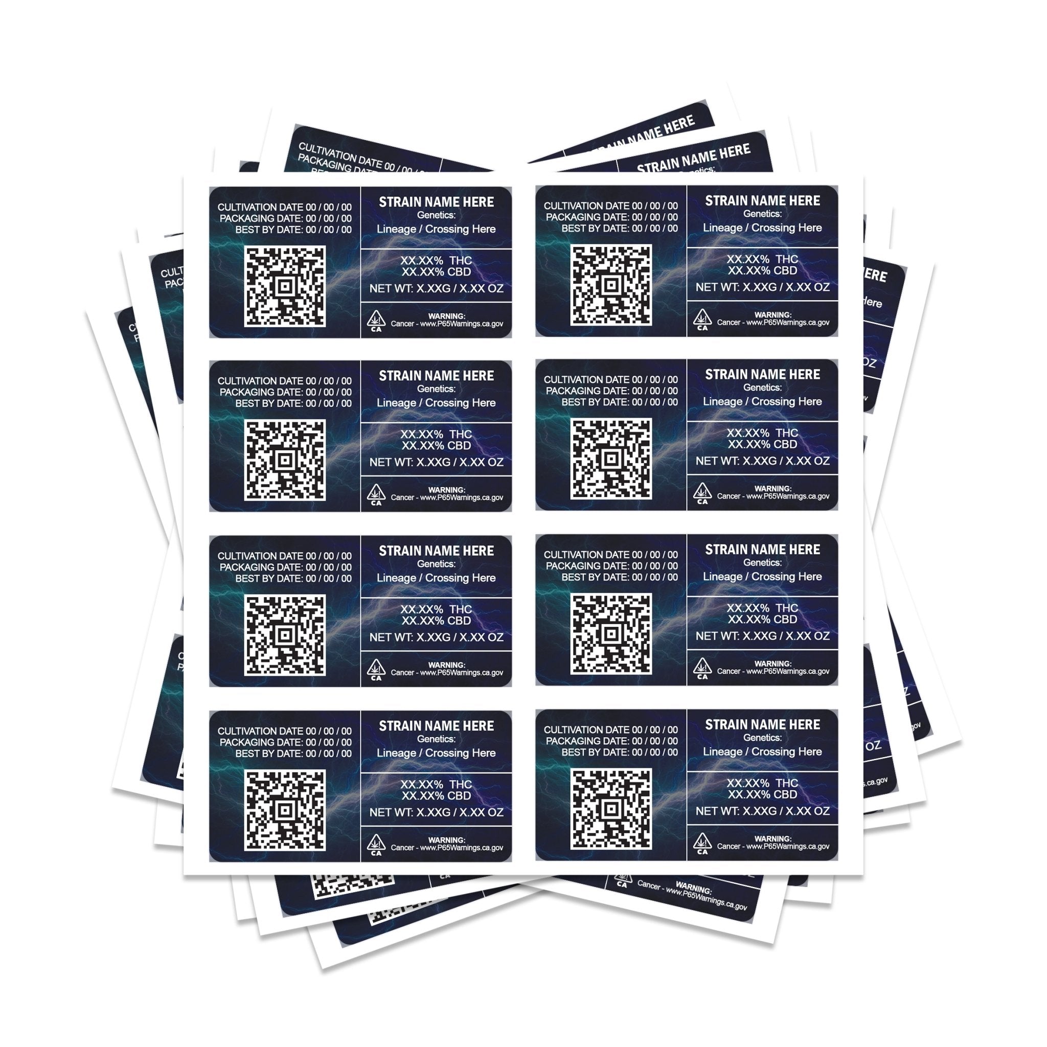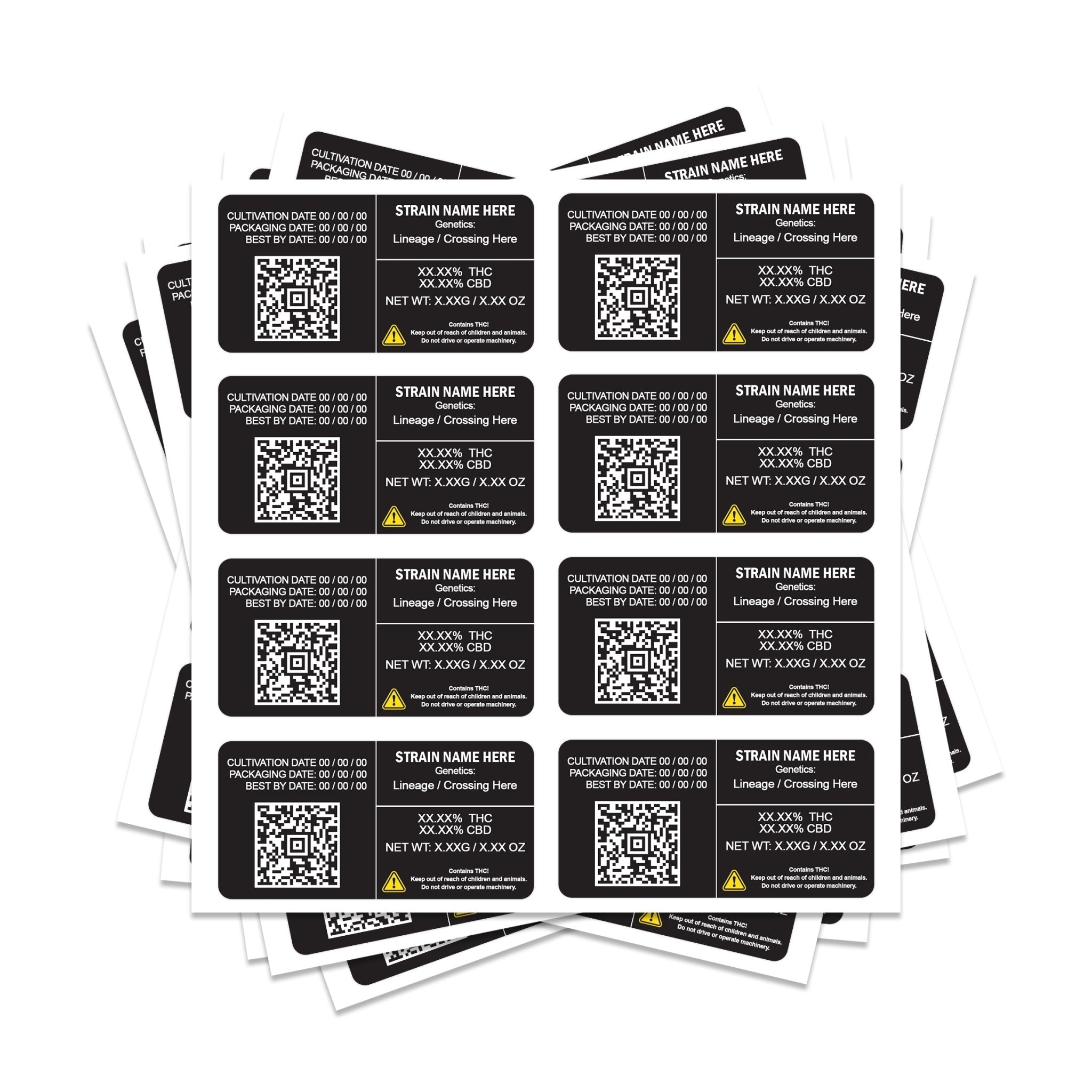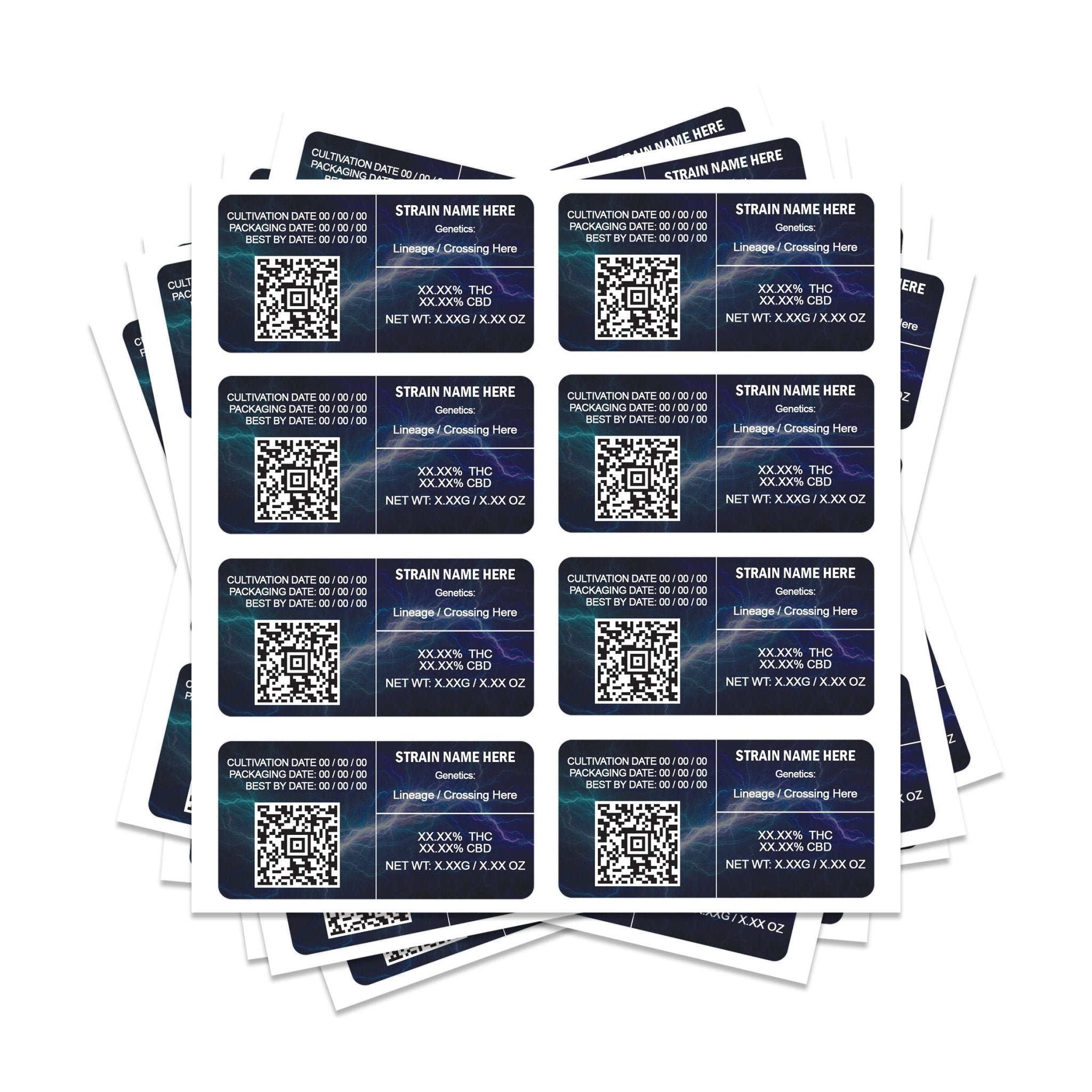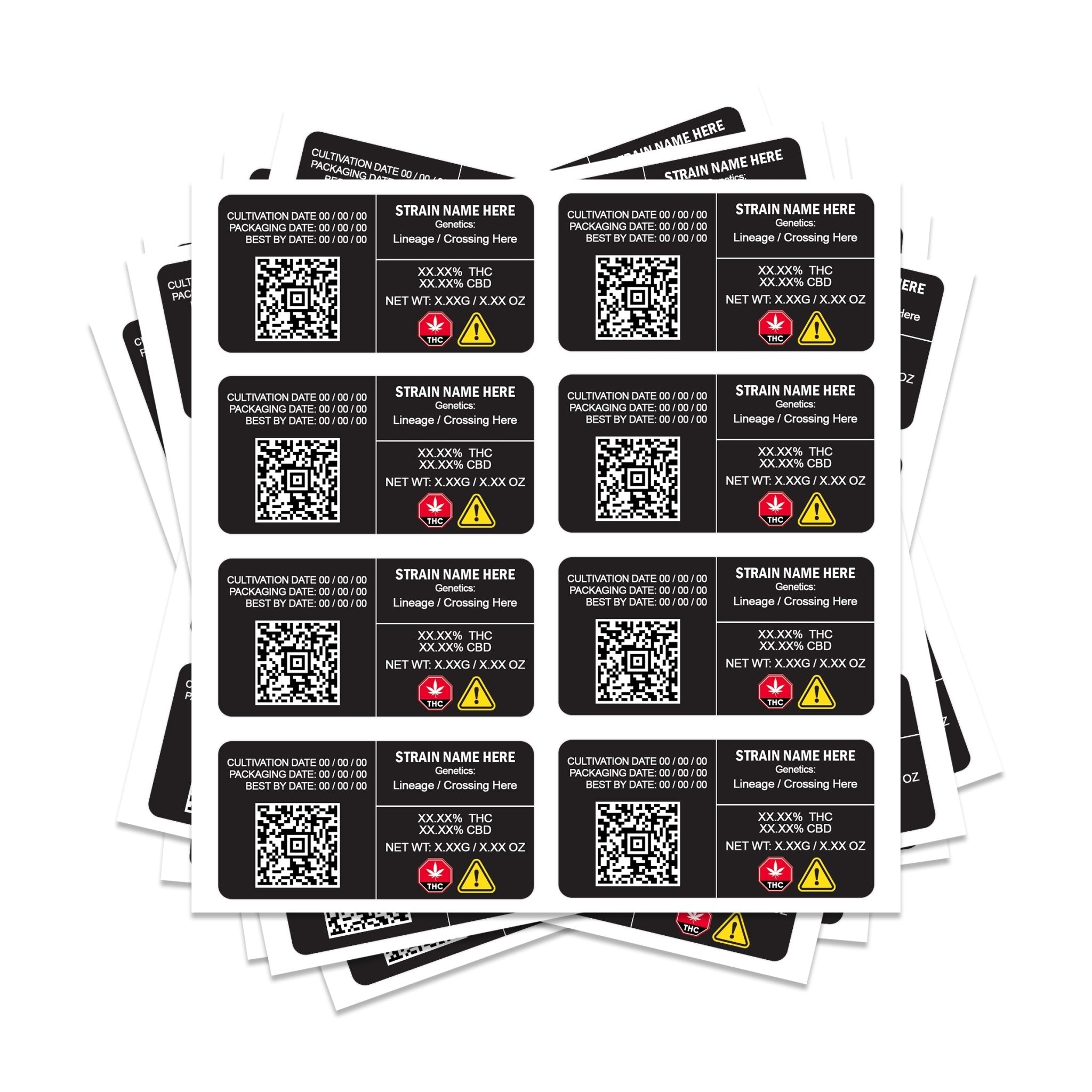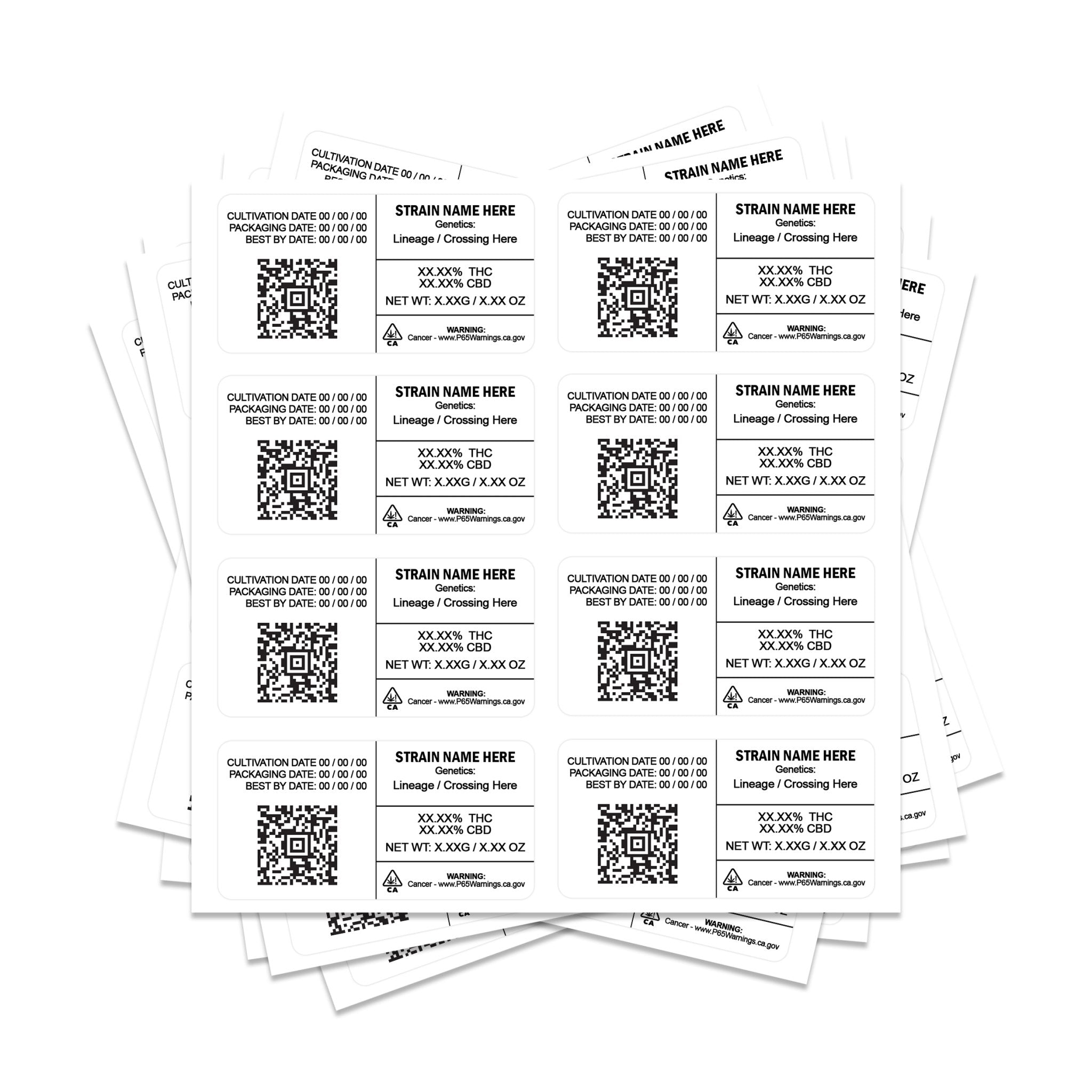 Étiquettes de tension QR rectangulaires 8x4 cm, parfaites pour les sacs mylar de 3,5 g et 7 g.