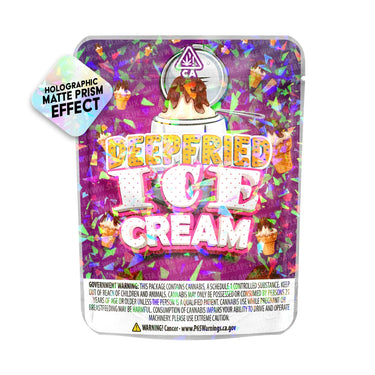 Sachets en mylar refermables et anti-odeurs, avec vinyle Deep Fried Ice Cream autocollant pré-appliqué, à effet prisme holographique mat.