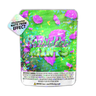 Sachets en mylar refermables et anti-odeurs, avec vinyle Forbidden Mints autocollant pré-appliqué, à effet prisme holographique mat.