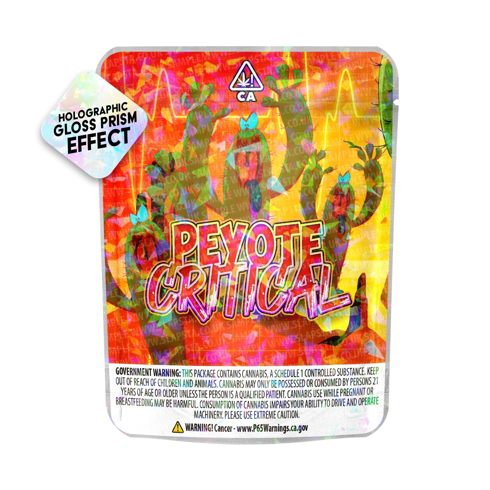 Sachets en mylar refermables et anti-odeurs, avec vinyle Peyote Critical autocollant pré-appliqué, à effet prisme holographique mat.