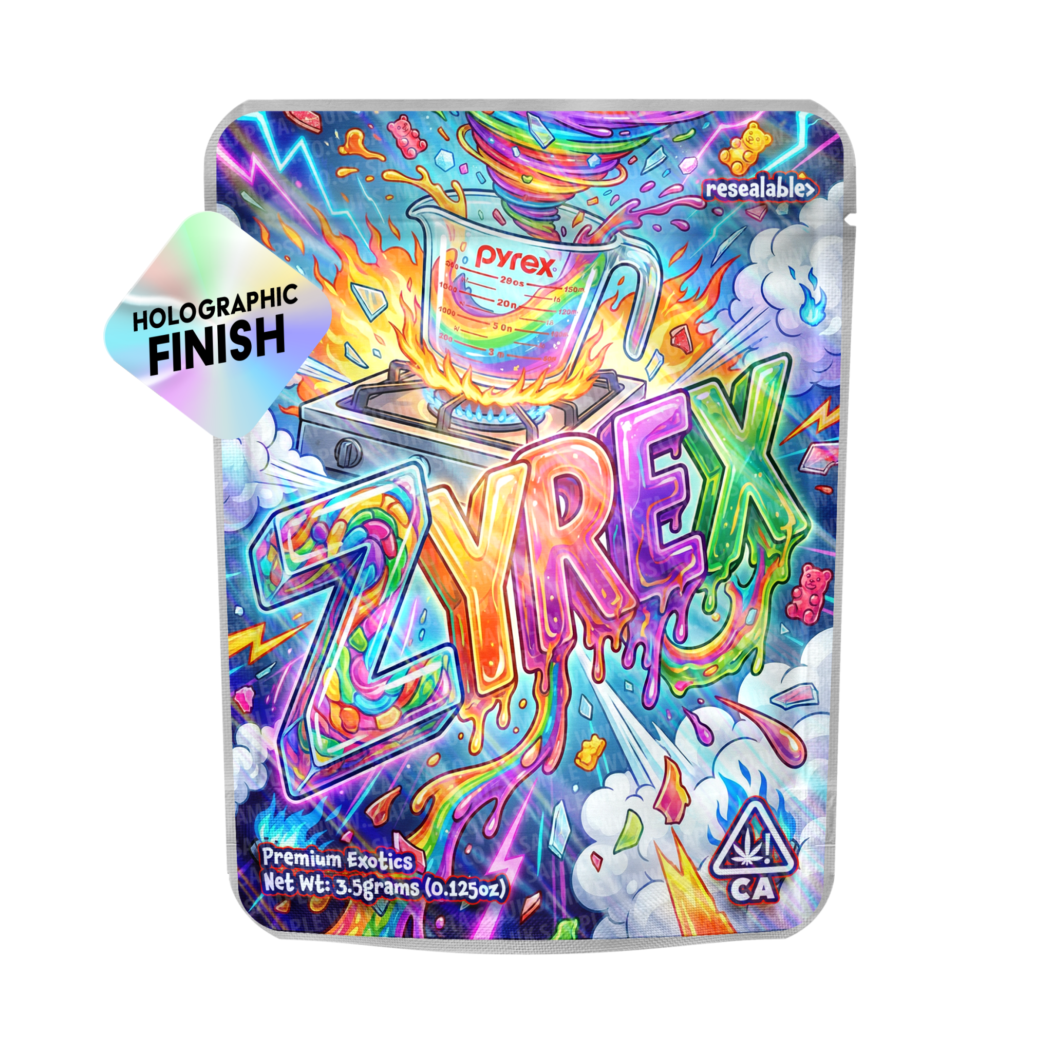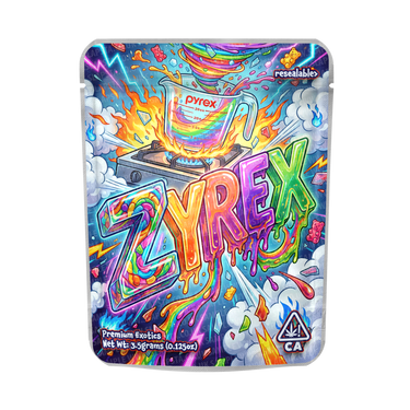 Premium resealable smell-proof mylar pouches featuring a Zyrex vinyl label professionally pre-applied, ideal for fast retail-ready packaging.